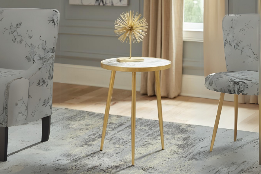 * Handcrafted mid-century modern accent table celebrates artisan craftsmanship * Three legs in gold finish provide unique touch * White marble and gold construction |