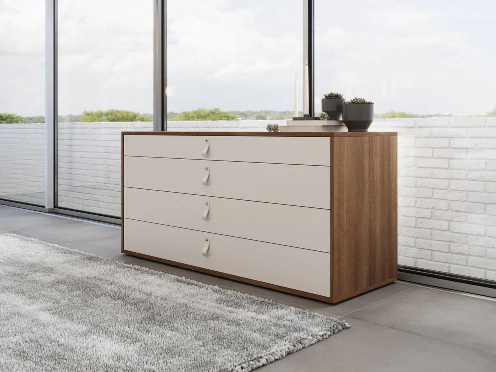 The Agoura dresser in walnut with taupe drawers and leather handles by Casabianca Home provides both versatile style and comfort with a ultra-modern that can easily be integrated into your current bedroom decor. This Agoura dresser features four soft close drawers adding elegance with functionality to your space.