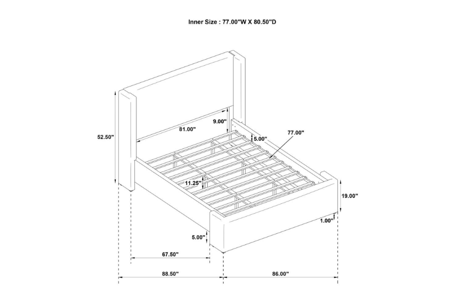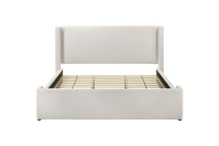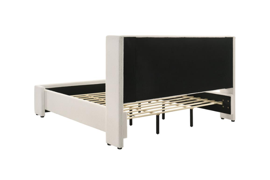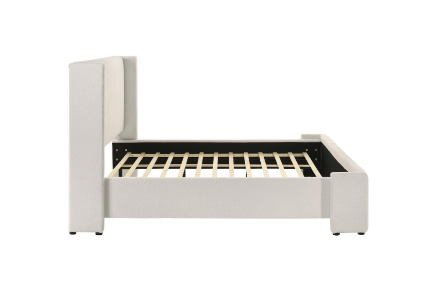- Modern upholstered bed adds soothing, timeless energy with a wingback silhouette - Fresh white boucle upholstery is textured and inviting, offering dimension in your bedroom - Features a modern profile with a tall headboard and low footboard that brings open, airy appeal - Features upholstered rails with a recessed look achieved with the wraparound head and footboards - Includes a robust slat kit with center supports for optimal performance of your chosen mattress set |