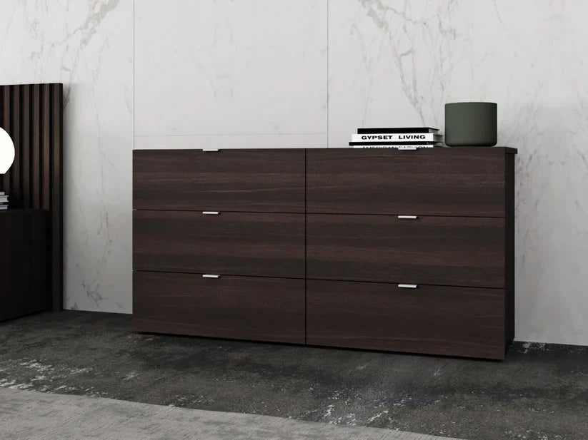 The Alexander dresser in dark oak by Casabianca Home provides both versatile style and comfort with a ultra-modern that can easily be integrated into your current bedroom decor. This Alexander dresser features six soft close drawers adding elegance with functionality to your space.