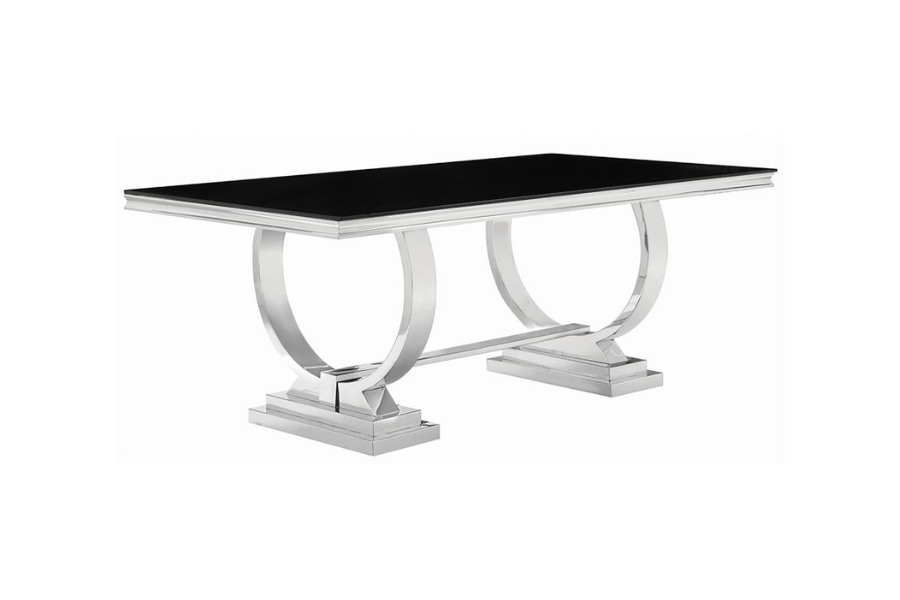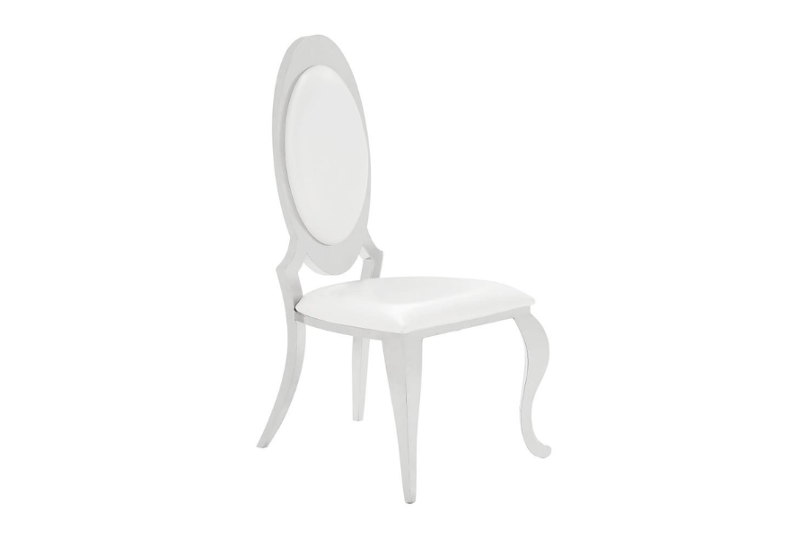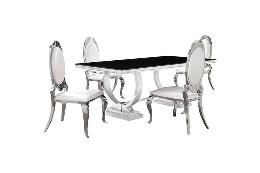 | - This collection with polished chrome and black marble finishes is perfect for a luxurious and modern dining space - Polished chrome table base has an Art-Deco flair with swooping double hoop shape - Stunning black tempered glass shows well with the shine of the chrome table base - Oval back chair design with curvy legs is reminiscent of fairy tale style in pearlized cream leatherette - Stainless steel construction is built to last |