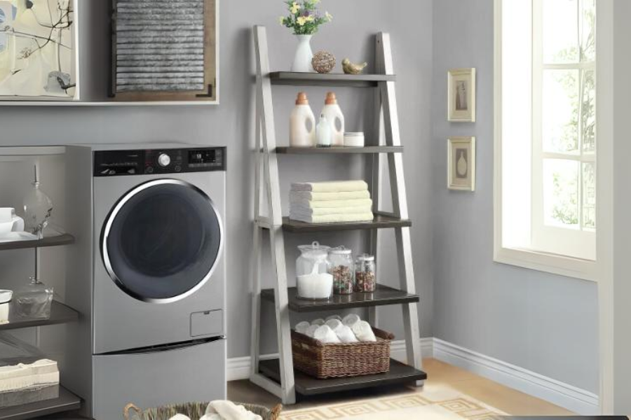 The Ashlyn Ladder Bookcase will complement any room in your home. A bold 72 inches high, it offers five fixed shelves. The shelves are designed in a step fashion with each shelf a bit larger than the next. Offering a multitude of display possibilities, the Ashlyn Ladder Bookcase features a two-tone antique white and gray finish. This bookcase is crafted with poplar solids and oak veneers.