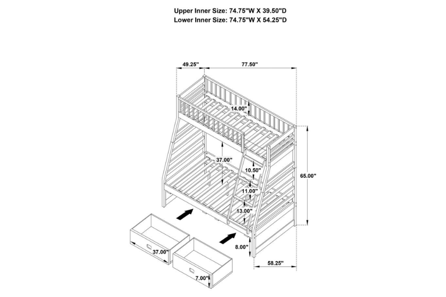* Twin over full bunk bed with sleek, simple style finished in grey * Easy organization with included two (2) drawer under-bed storage * Constructed with solid pine, plywood, and MDF * Slat kits included * Available in cappuccino, honey, white, navy blue, and grey |