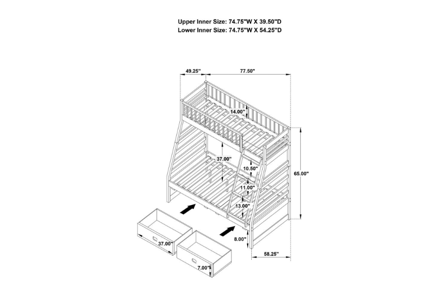 * Twin over full bunk bed with sleek, simple style finished in white * Easy organization with included two (2) drawer under-bed storage * Constructed with solid pine, plywood, and MDF * Slat kits included * Available in cappuccino, honey, white, navy blue, and grey |