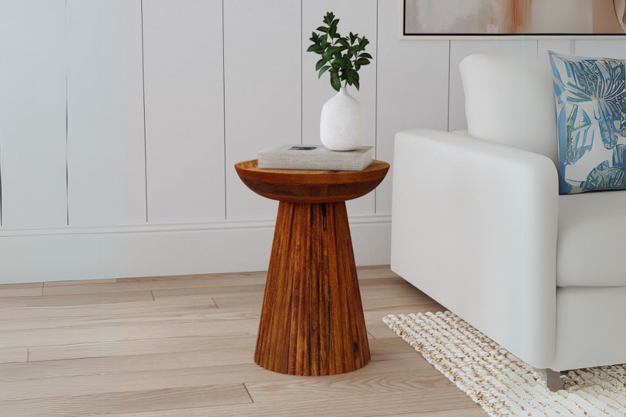 * Bold artisan charm infuses a modern wood side table with engaging character * Round bowl-shaped table top highlights gentle curvature and brings an elegant presentation * Pedestal base features a conical profile with chic scalloping that adds rich texture and dimension * Features beautiful mango wood construction with a wild honey finish that is deep and warm * Beautiful alone in a foyer or flanking a sofa or armchair to provide a place for refreshments |