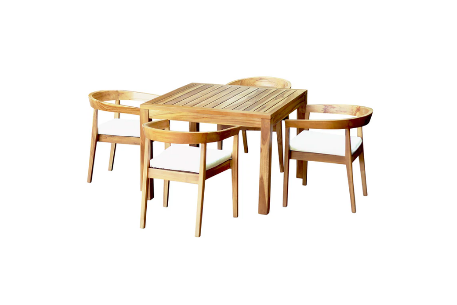 Impress your guests and elevate your outdoor dining experience with the stunning Panama Jack Bali Teak 5-Piece Square Dining Table with Cushions. This acacia wood dining set features a classic slatted tabletop that provides a low-maintenance yet sophisticated dining experience for family and friends. The set is crafted with top-quality Grade "A" acacia wood, ensuring both durability and style, and allowing you to create your perfect outdoor oasis. The set includes cushions that come in a standard 100% off-white Polyester fabric, or choose from a wide range of Sunbrella options to add your unique personal touch. To maintain the original golden teak color, simply apply light sanding and teak oil every few months. Transform your outdoor dining area into a chic and comfortable retreat with the Panama Jack Bali Teak 5-Piece Square Dining Table with Cushions.