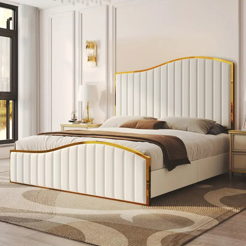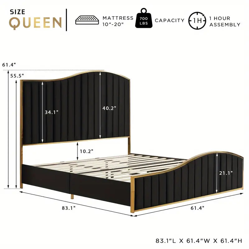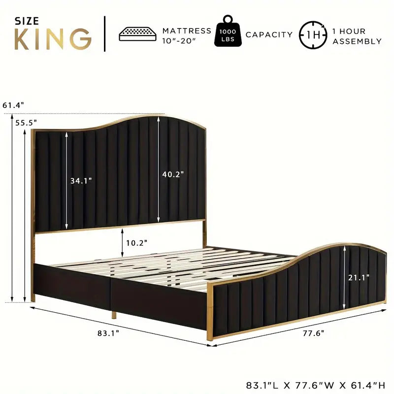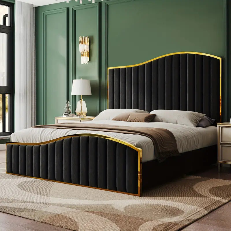 61.4" High Headboard Platform Bed Velvet Upholstered with Gold Trim & Footboard/Wooden Slats/No Box Spring Required