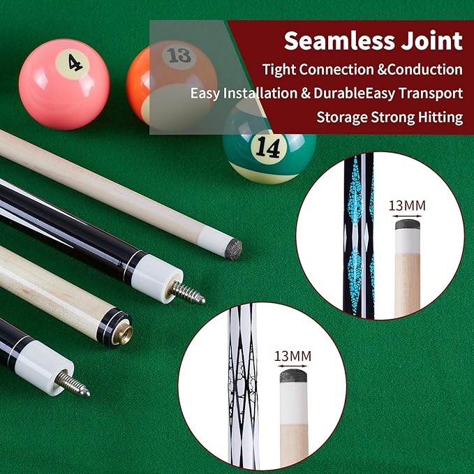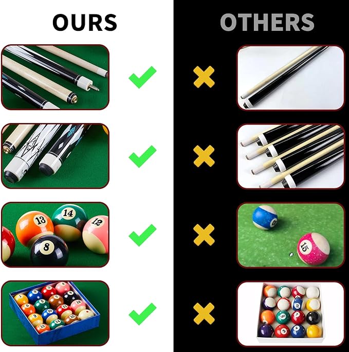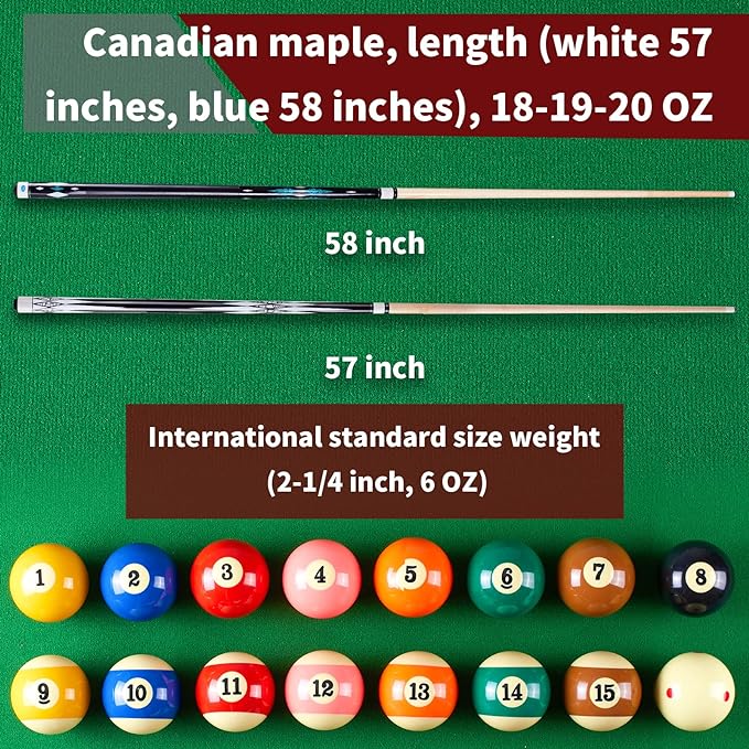 Production requirements: The billiard ball is made by the Belgian billiard process - the pool cues are manually tested and packaged (the sticks are 100% straight)