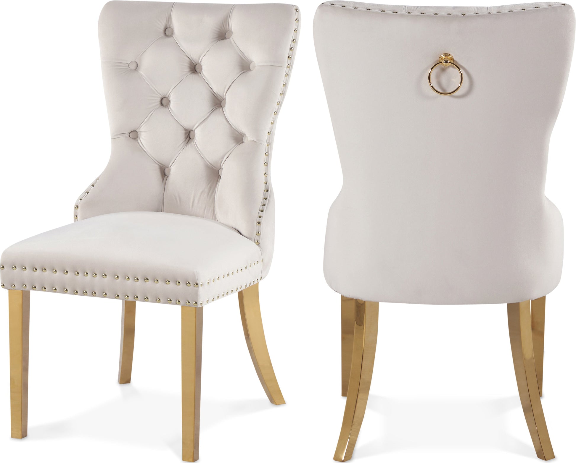 Make a huge impression on guests when you seat the in this Carmen velvet dining chair. A blend of modern beauty and timeless, classic design elements, this chair features luxuriously crafted cream velvet upholstery that's buttery soft to the touch and sleek and chic against the skin. The back of the chair has deep button tufting to help keep its padding from shifting and adding to its comfort factor for guests. A gold knocker on the back and gold nailhead trim add to the upscale feel of this handsome chair.