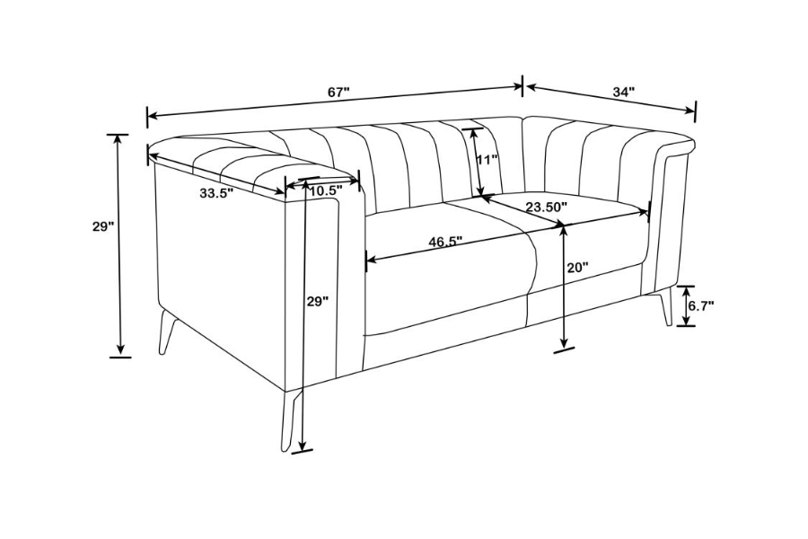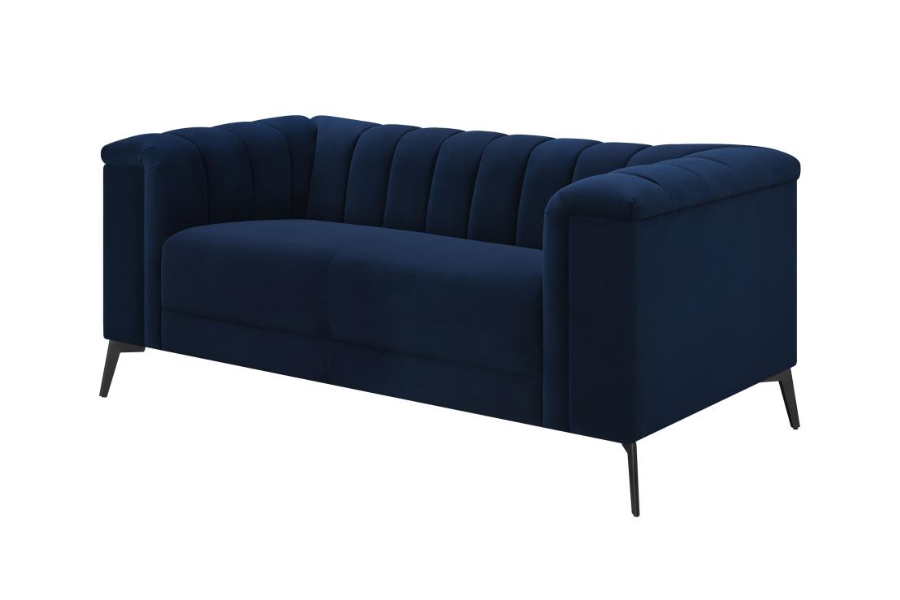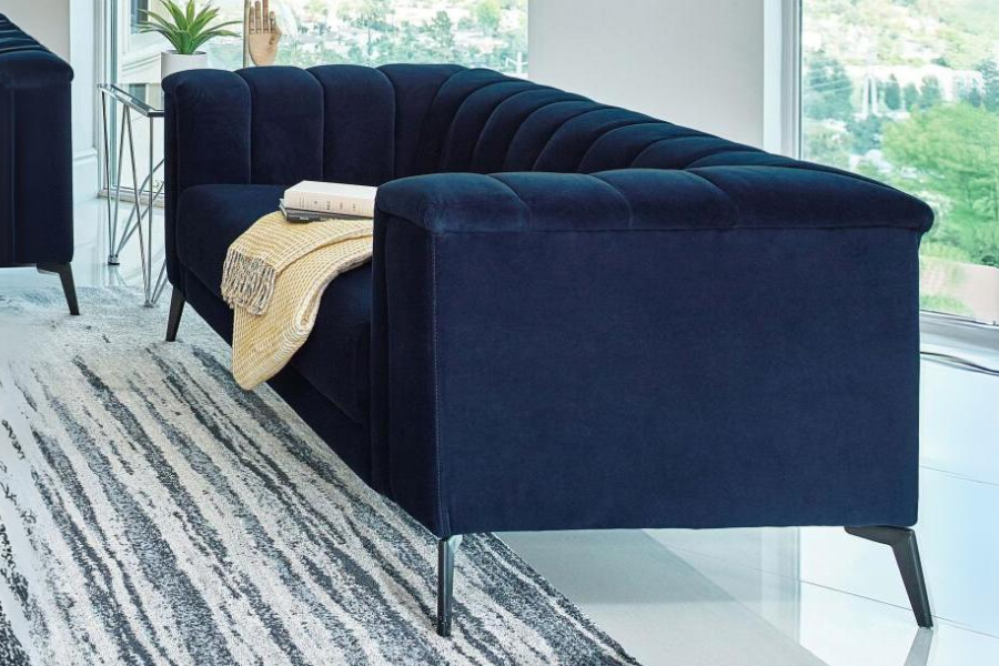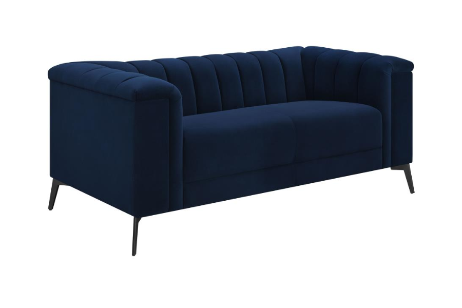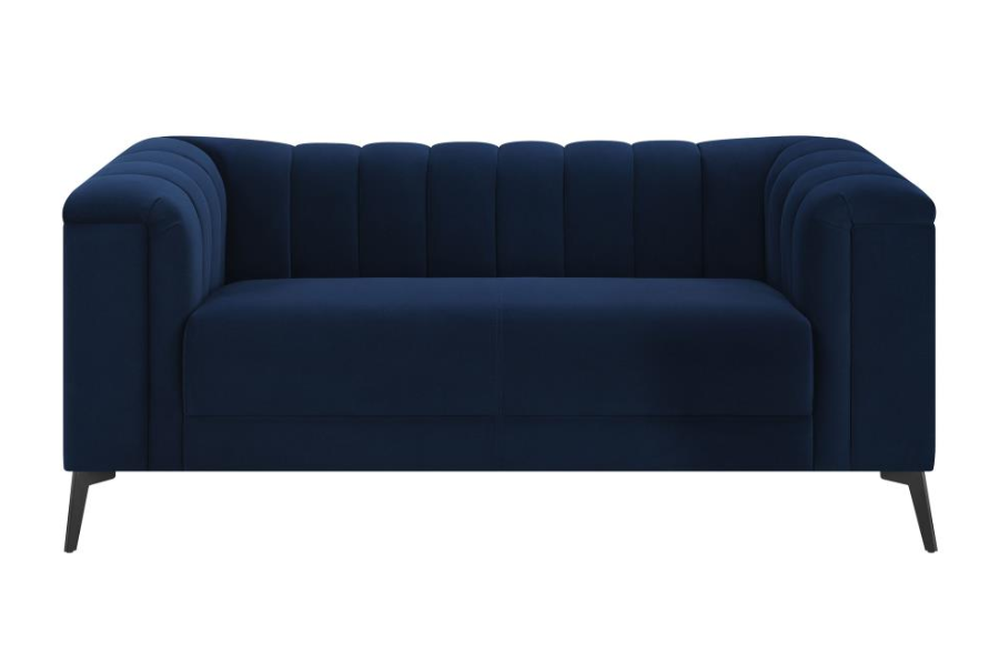 * A beautiful matte track free navy blue velvet featured with this collection * Shelter back and inside arms highlight the deep vertical channels * Tight waterfall bench seating with pocket coil springs for comfort and support * Accented with tapered black metal legs |