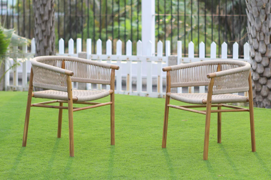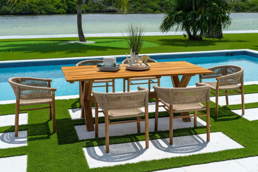 Looking to elevate your outdoor living area? The Panama Jack 7-Piece Corsica dining set is a stunning addition to any patio, balcony, or poolside space. Made of solid acacia wood in a honey-hued finish, this dining set is perfect for hosting friends and family for meals or drinks. The modern tan cording seat and backrest is designed to dry quickly, so you won't have to worry about rain or wet swimsuits. Pair this beautifully crafted set with other items from the Corsica collection to create your dream outdoor oasis. For maintenance, simply apply light sanding and teak oil every few months to restore the original golden teak color.