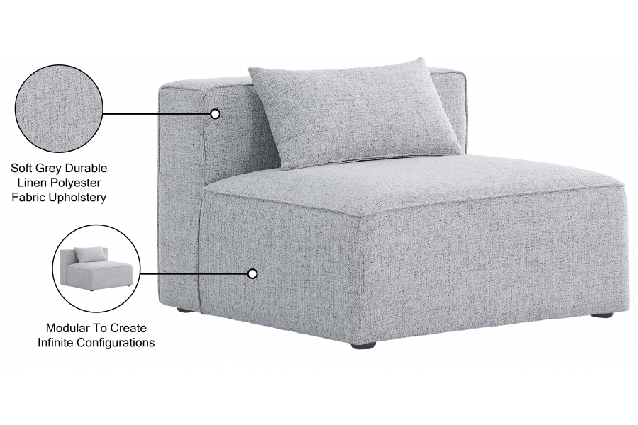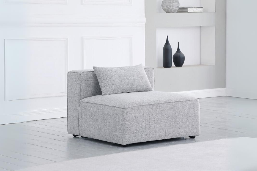 Treat yourself to some long overdue "me time" when you're seated on this Cube Modular Armless Chair. This beautiful modular unit is both eye-catching and elegant, features durable linen textured upholstery in a soft grey color that meshes well with nearly any existing color scheme. Pair this modular Armless Chair with other items in the same collection to create an unlimited number of combinations and enjoy the custom seating arrangement of your dreams. Latches underneath make it easy to attach pieces to one another.