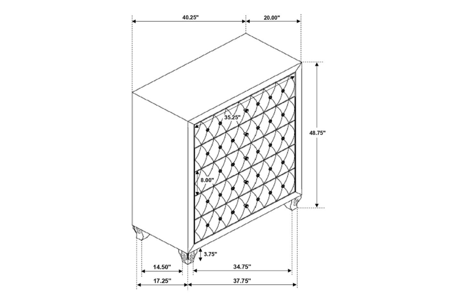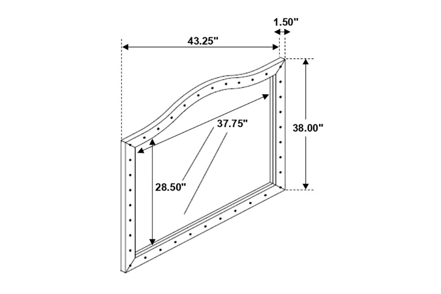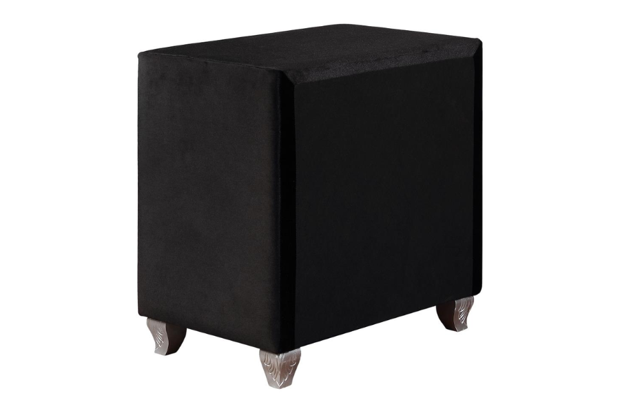 * Create your ultimate retreat with a truly magical bedroom collection in black velvet * Each collection piece is upholstered in plush, soft velvet and tufted with facetted buttons that sparkle perfectly * Hand-applied nail heads trace gentle contours * Scrolled double wings on an arched headboard create bold drama * Removable jewelry tray featured in dresser * Fully slatted platform bed * Also offered in silver grey velvet * Asian hardwood frame with plywood and particle board * Slat kit included |