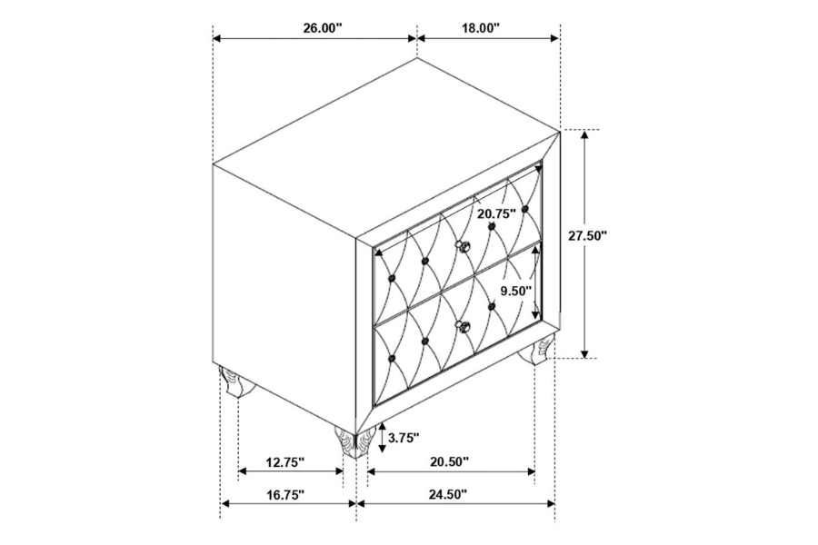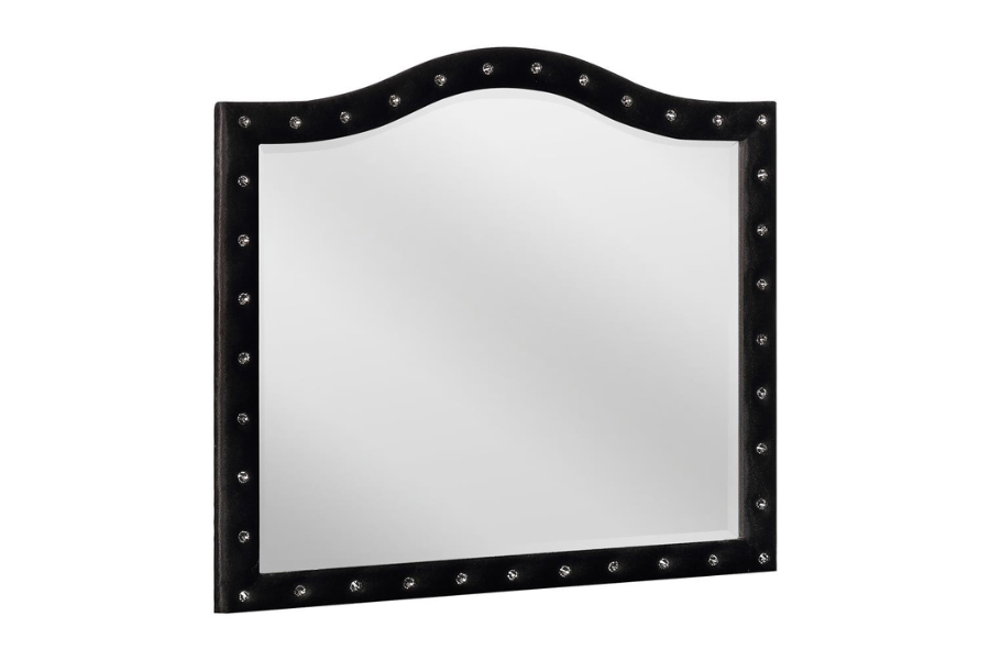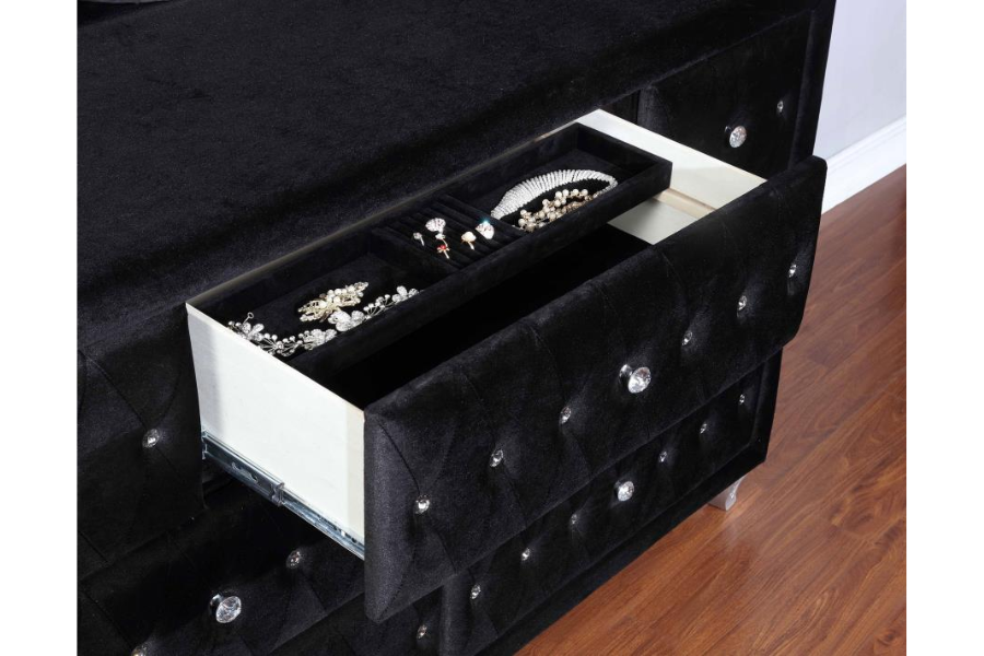 * Create your ultimate retreat with a truly magical bedroom collection in black velvet * Each collection piece is upholstered in plush, soft velvet and tufted with facetted buttons that sparkle perfectly * Hand-applied nail heads trace gentle contours * Scrolled double wings on an arched headboard create bold drama * Removable jewelry tray featured in dresser * Fully slatted platform bed * Also offered in silver grey velvet * Asian hardwood frame with plywood and particle board * Slat kit included |