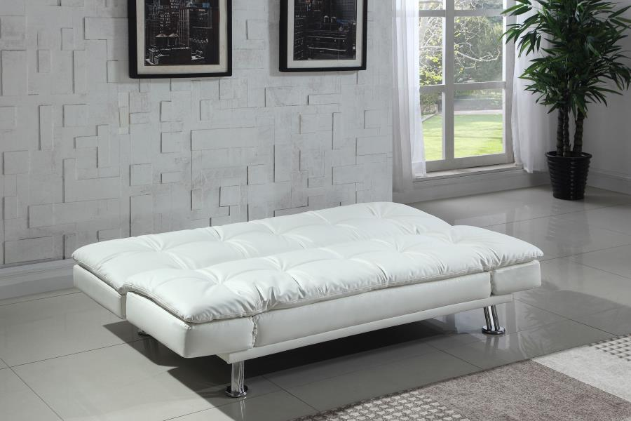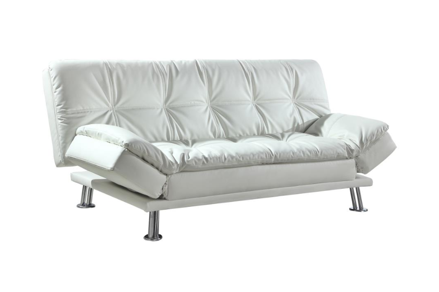 * Modern sofa bed collection upholstered in white leatherette * Back folds flat for easy conversion from sofa to bed * Adjustable armrests for added comfort * Kiln-dried hardwood frame * Durable sinuous spring decking with high resilience foam seat * Metal legs electroplated in chrome * Also available in brown, grey, and black leatherette |