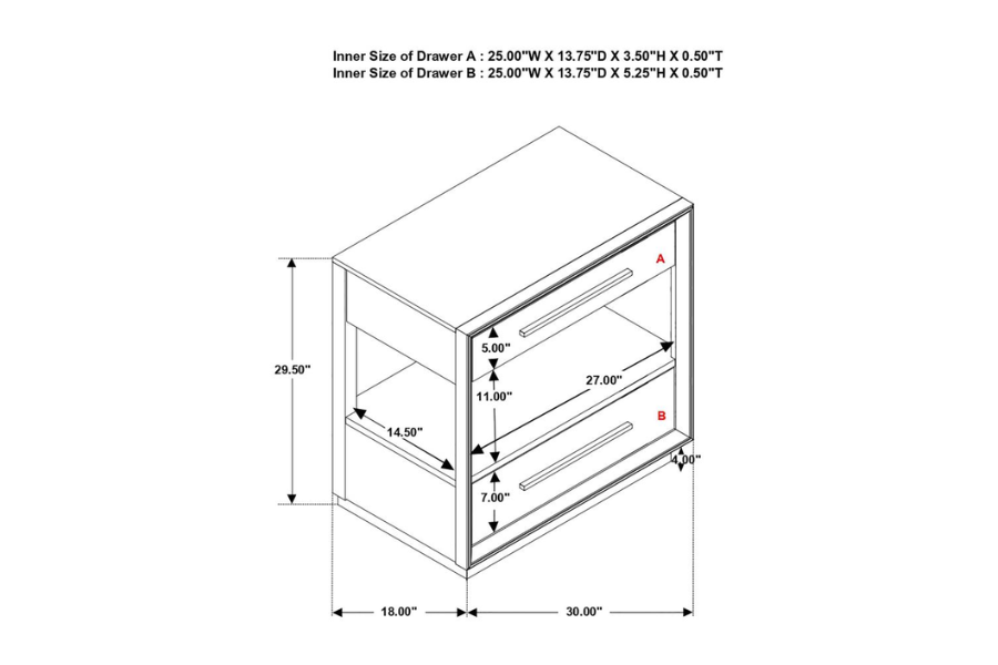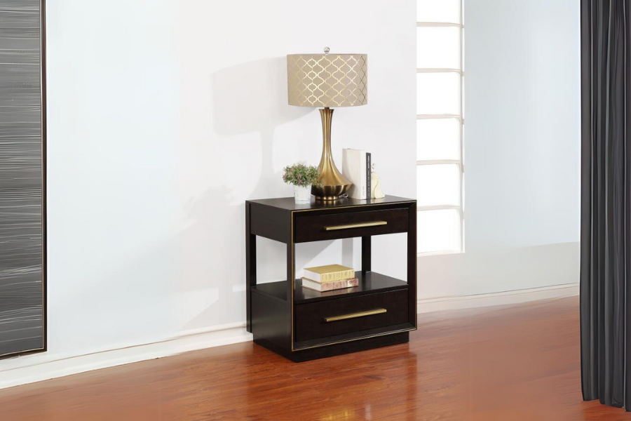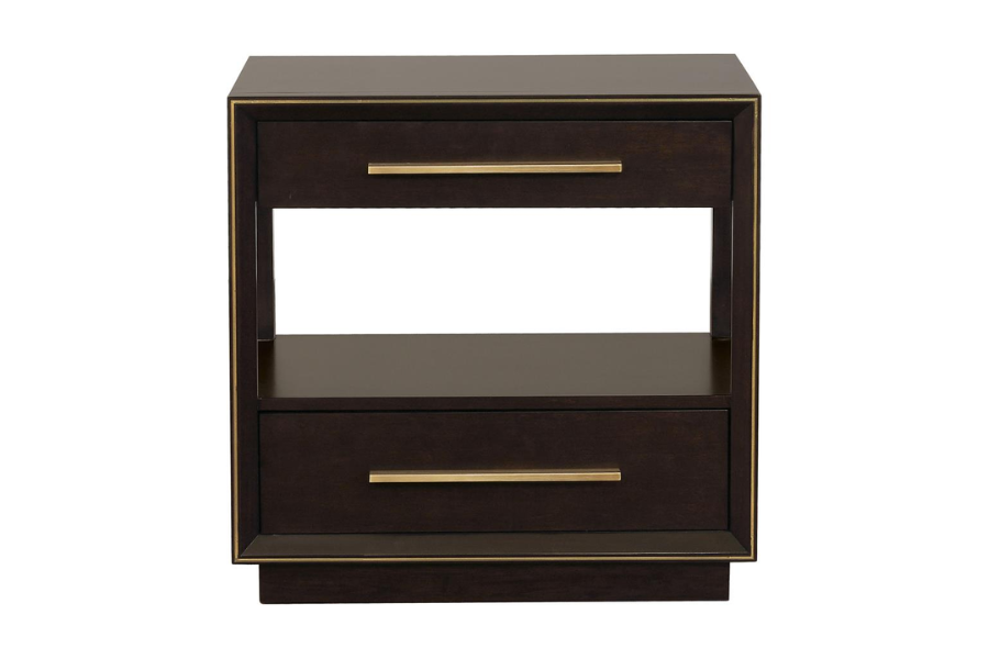 * Two-drawer nightstand in a rich smoke peppercorn finish for a modern bedroom * Features elongated metallic drawer pulls for a sleek, retro-inspired look * Constructed with a simple and smooth frame for a structured aesthetic * Includes a shelf between the drawers for additional storage or display space * Stands on a smooth base that reaches the floor, enhancing its bold visual appeal |