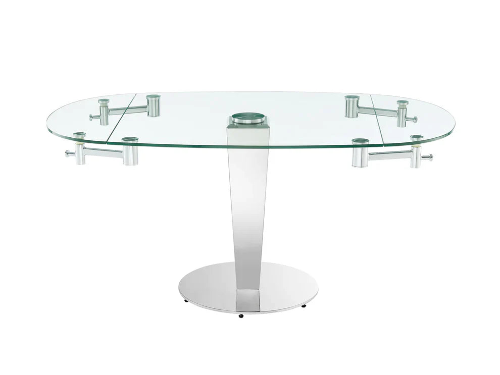 The Enzo manual dining table with stainless base and clear top by Casabianca Home provides today's home with ultra-modern luxury designs that brings a blend of sophisticated styling and modern contemporary designs into any space. This Enzo manual dining table extends from 40" to 63" providing ample space for 4 - 6 seats.