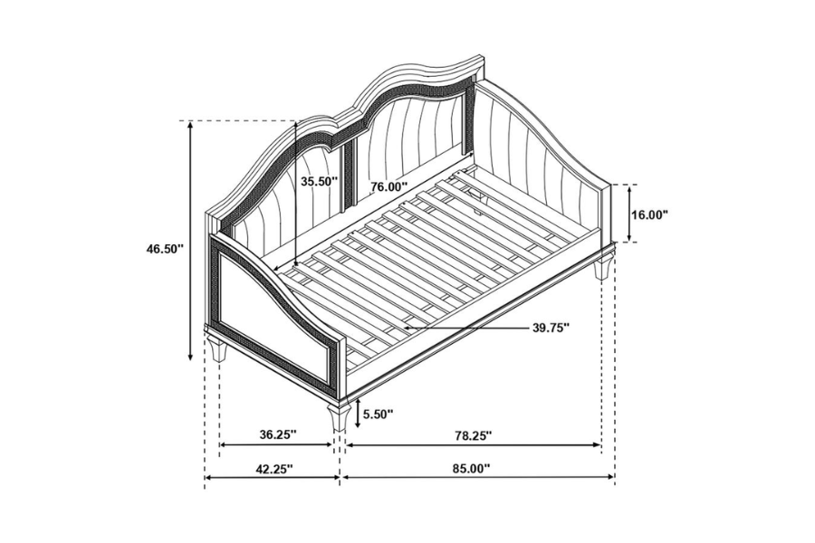 * The Evangeline daybed is perfect for accommodating overnight guests or creating functional small spaces * Its eye-catching and versatile design features a curved silhouette and faux diamond trim * The daybed is constructed from solid wood and upholstered in a soft, durable fabric |