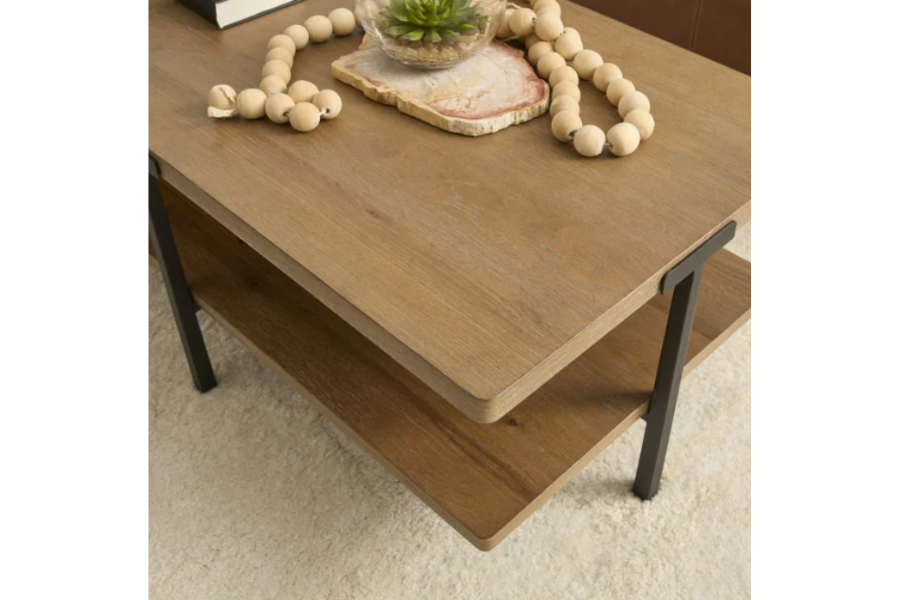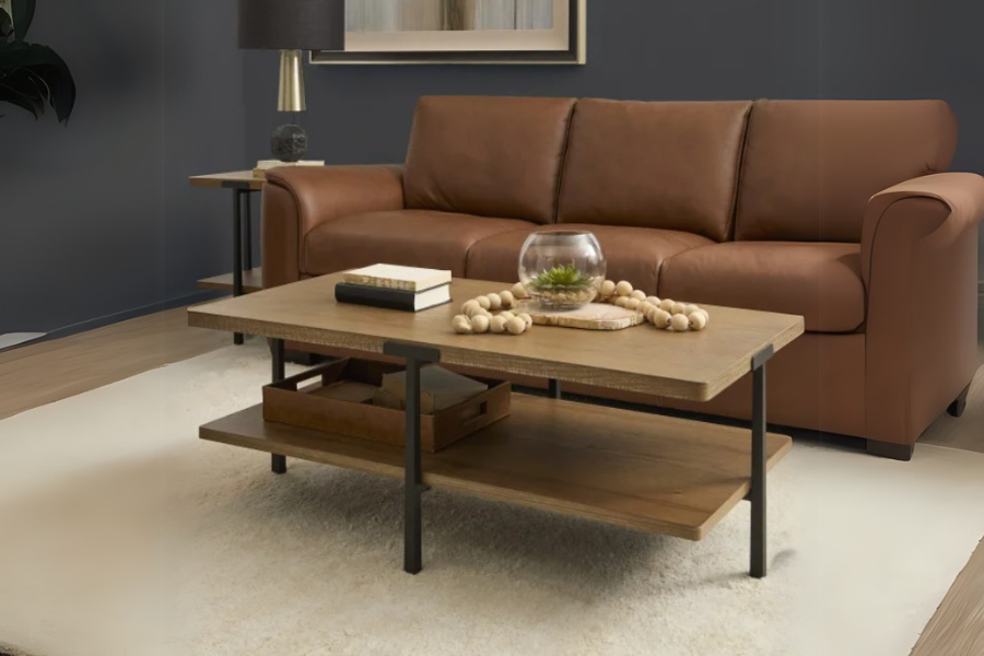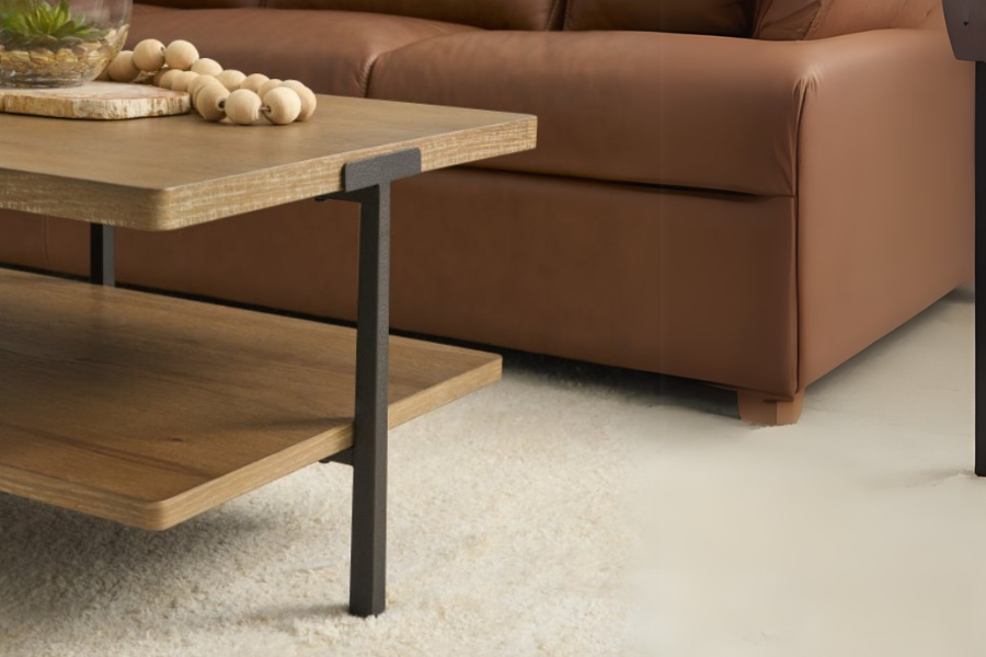 Sophistication meets rustic, industrial charm with the Flexsteel rectangular coffee table. Seamlessly blending high-contrast materials and finishes in perfect harmony, this table makes a captivating statement in any living space. A textured steel frame is highlighted by warm copper undertones, while a distinctive wood top and lower shelf exude character with natural knots, subtle saw marks and a white cerused finish that accentuates the rich umber wood grain.