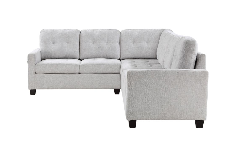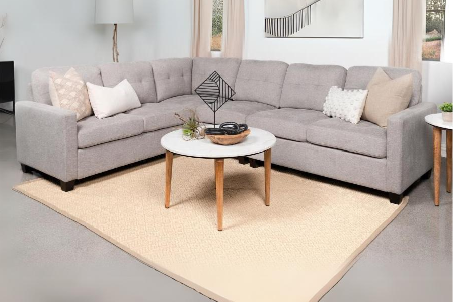 * L-shaped sectional provides ample seating and lounging for family and friends * Tufting adds depth and texture to cushions while maintaining a modern look and feel * Dimensional beige upholstery is neutral but warm and inviting, perfect for a family living area * Back cushions are reversible for added versatility, with webbed decking for support * Seats feature sinuous spring decking for optimal, no-sag seating and attached cushions |
