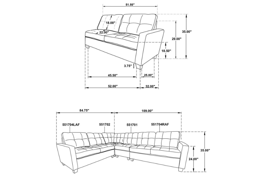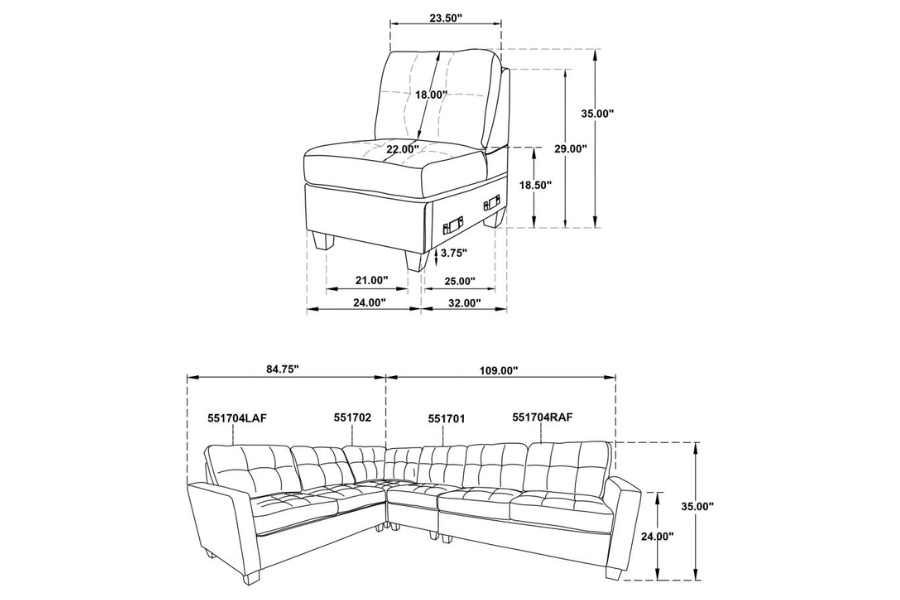 Includes: One (1) armless chairs, one (1) corner chair, one (1) LAF loveseat, and one (1) RAF loveseat |