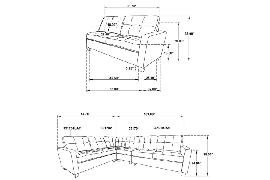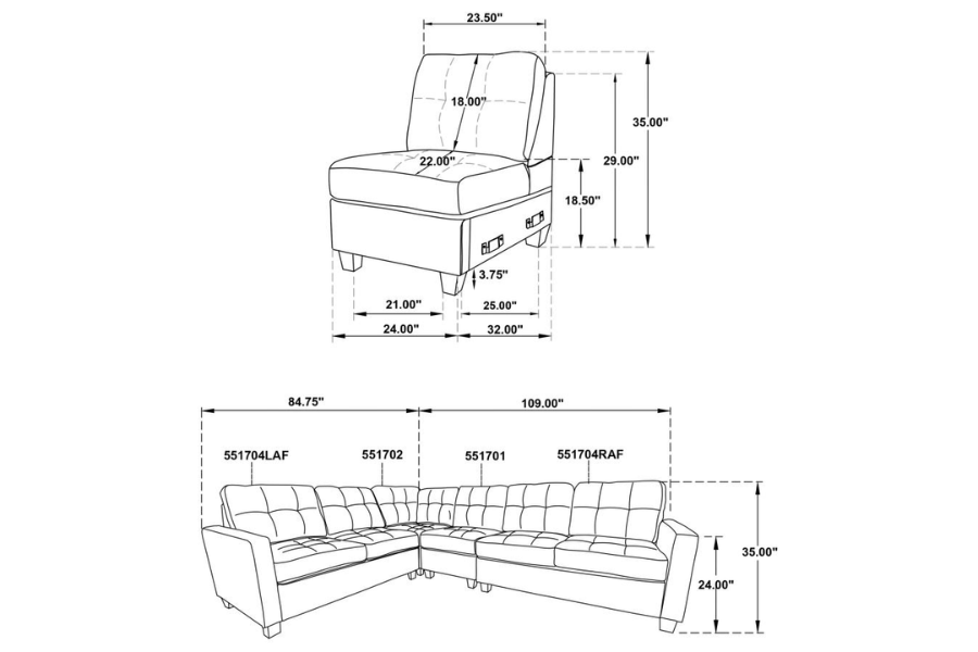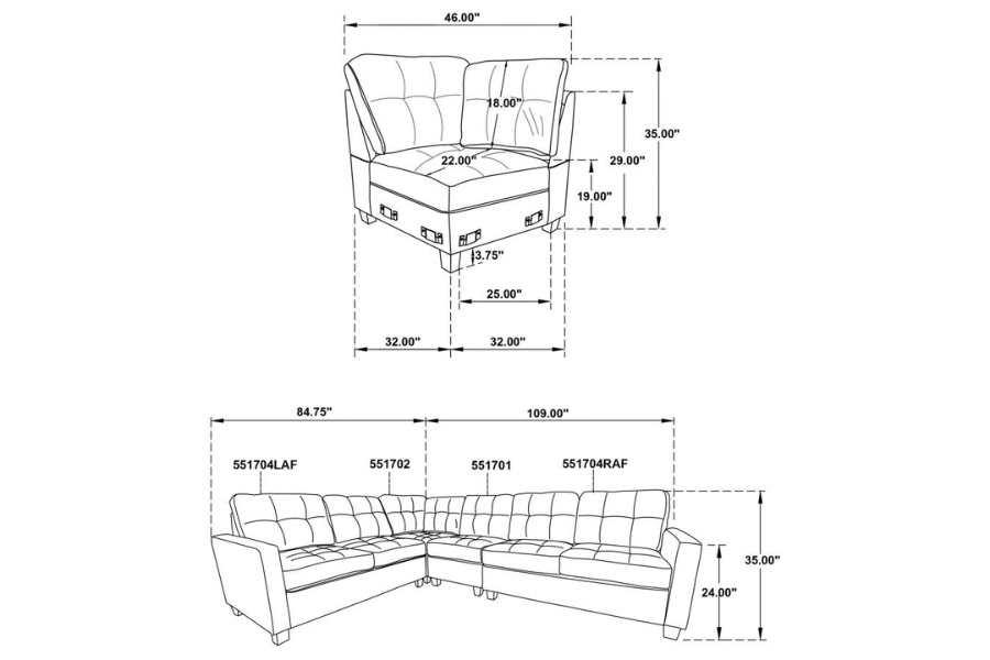 Includes: One (1) armless chairs, one (1) corner chair, one (1) LAF loveseat, and one (1) RAF loveseat |