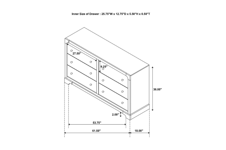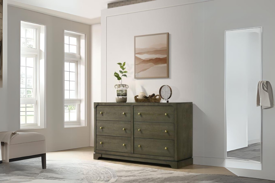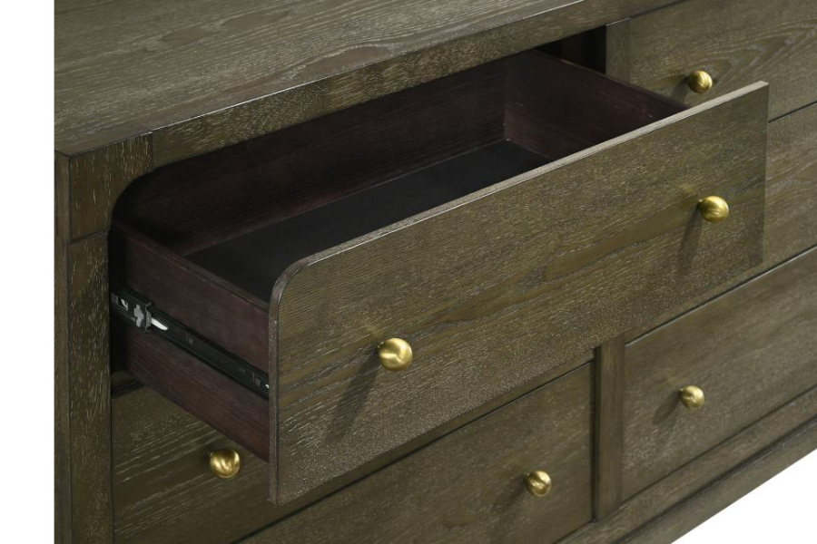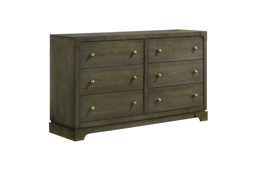 | * Spacious 6-drawer dresser with transitional design * Dark cocoa finish with brass knobs * Solid wood drawer box with English dovetail joinery * Felt-lined top drawers for added elegance * Crafted from solid hardwood, ash veneer, and MDF |