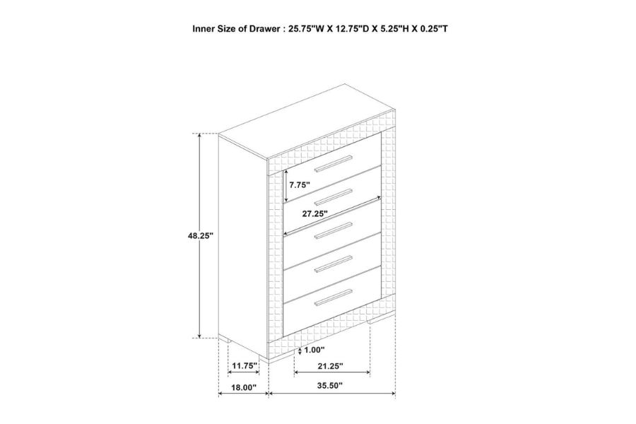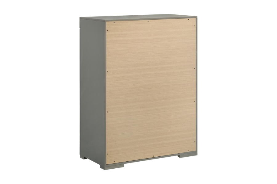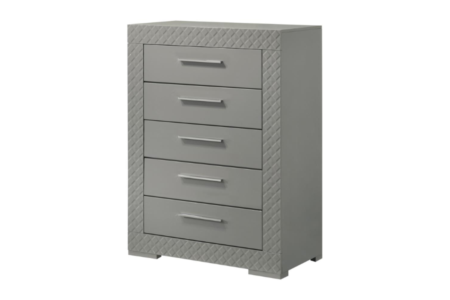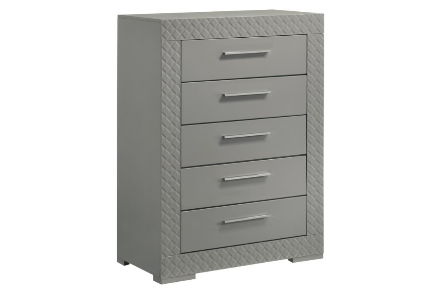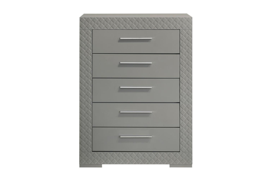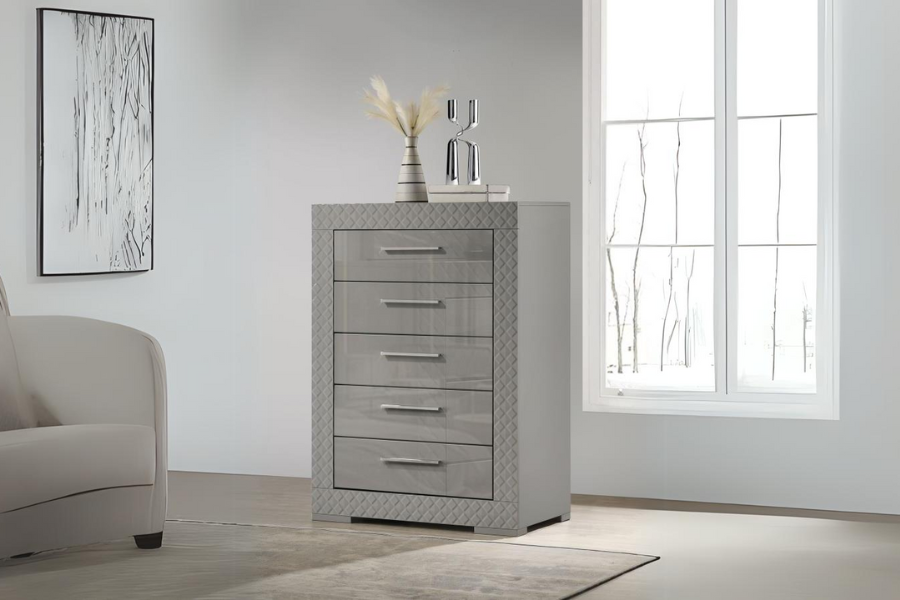 * Contemporary chest with grey high gloss finish * Five drawers with felt-lined top drawers for added protection * 3-dimensional diamond tile emboss adds texture and elegance * English dovetail joinery and metal glides ensure durability * Made from solid hardwood, engineered wood, and paper laminate |