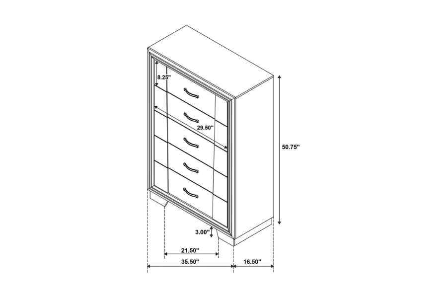 * 5-drawer chest with a mesmerizing glittering strip design and smooth grey oak finish * Black felt-lined top drawers for a luxurious touch and to ensure the safety of your valuables * Perfect balance of style and utility * Adds a statement piece to your living space * Exudes sophistication and elegance |