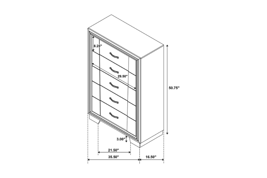 * Contemporary glamourous bedroom collection featuring glittering strips and shimmering drawer pulls * Subtle V-shaped panel design on the headboard and drawer fronts * Durable grey oak melamine finish * Black felt-lined top drawers to protect valuables * Low maintenance and easy to clean |