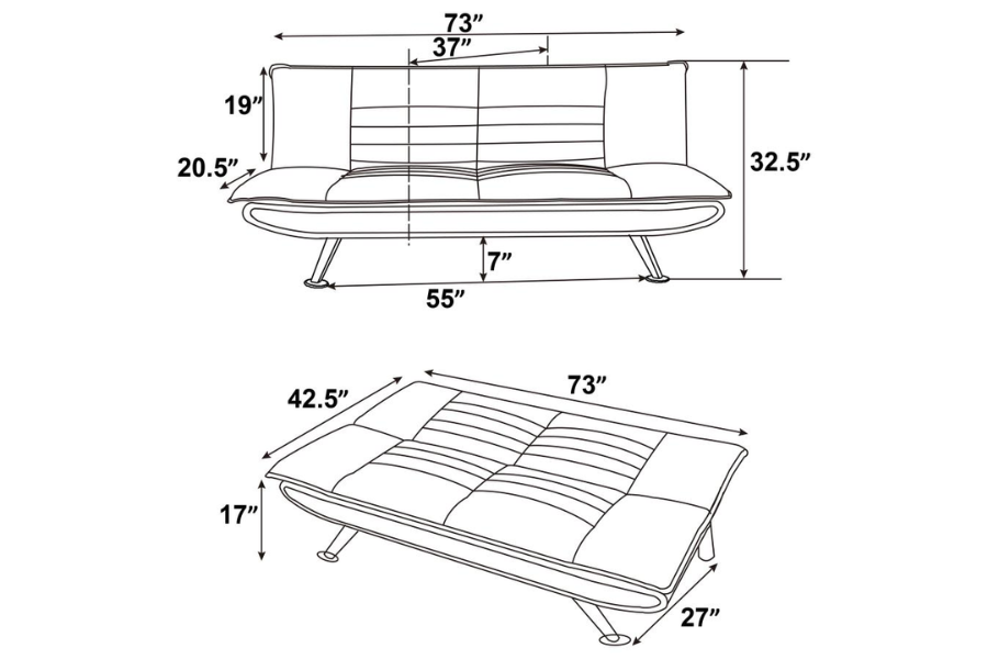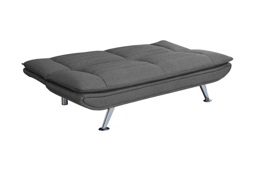 * Contemporary sofa bed upholstered in grey fabric * Channeled pillow-top seat and back * Back folds flat for easy conversion from sofa to bed * Kiln-dried hardwood frame * Durable sinuous spring decking with high resilience foam seat * Angled metal legs electroplated in chrome |
