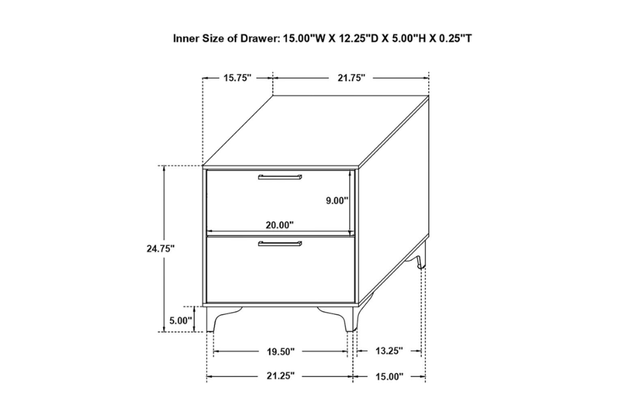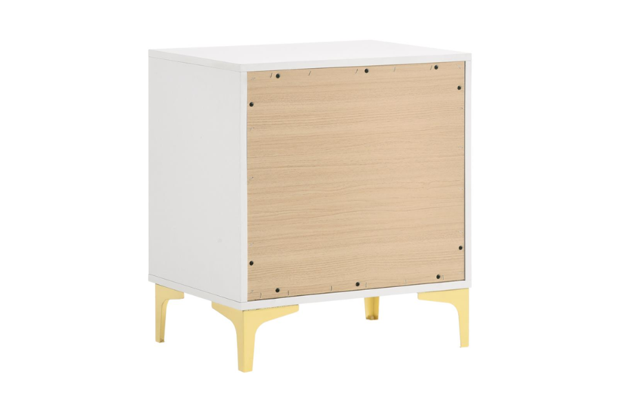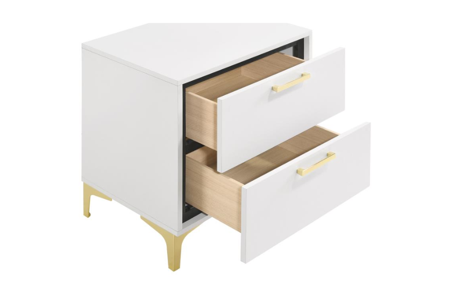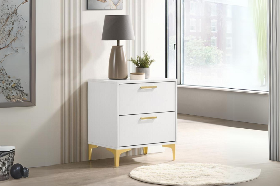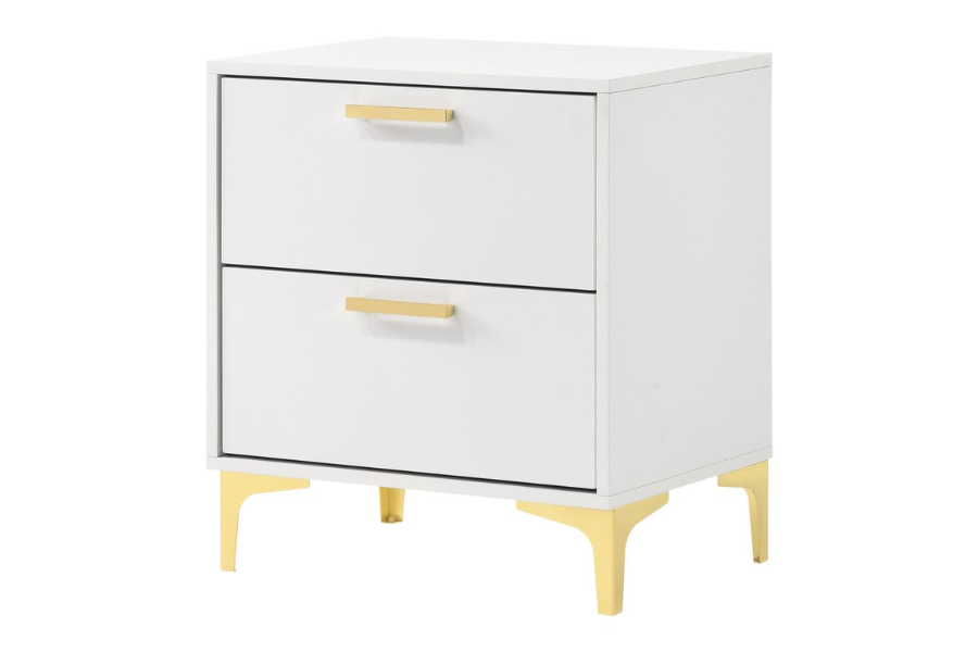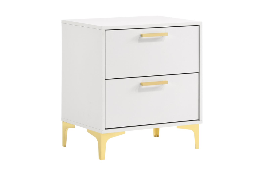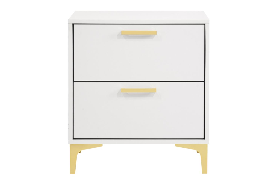 * Perfect for contemporary and modern bedrooms * Two deep drawers offer all the space you need for bedside essentials * The bright, white finished frame ensures a light and airy disposition * Gold finished pull handles create a luxe flair * Gold bracket style legs carry through the warm metallic accents |