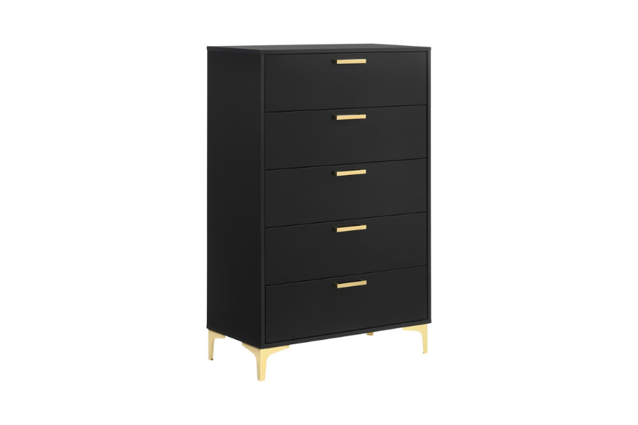 - Tall, boxy shaped frame offers a simple silhouette and saves floor space - A black finish complements all sorts of existing bedroom color palettes - Five deep drawers offer ample space for essentials - Gold finished bracket legs create a glamorous flair to reflect headboard - Gold finished slim pulls offer a glam touch and contrast |