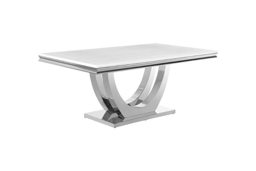 | - Spacious rectangular table top is perfect for hosting four guests or family members - A white faux marble tabletop keeps a classic and clean expression to your dining space - An open pedestal base with a flush bottom offers sweeping elegant curves for a contemporary flair - Parson-inspired dining chairs with a button-tufted flared backs offer an updated contemporary expression - Each seat is upholstered in a soft velvet fabric for a plush, luxurious look and feel |