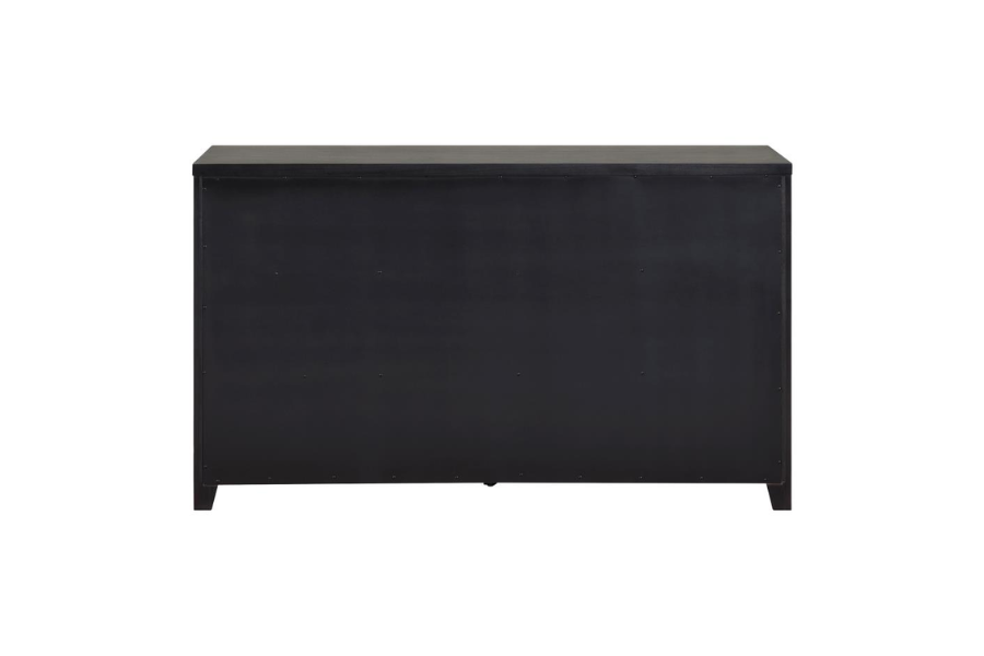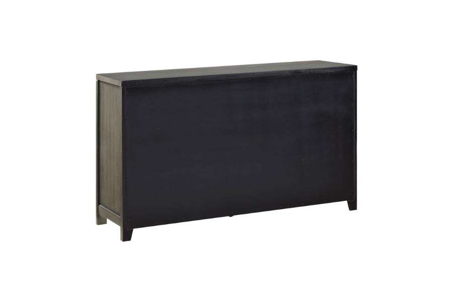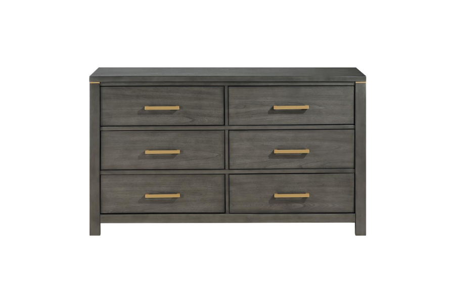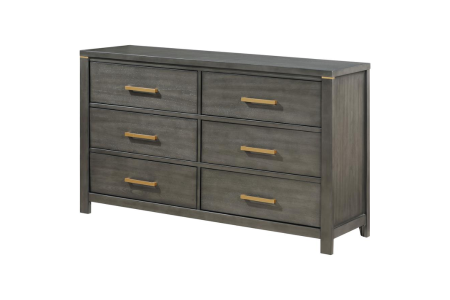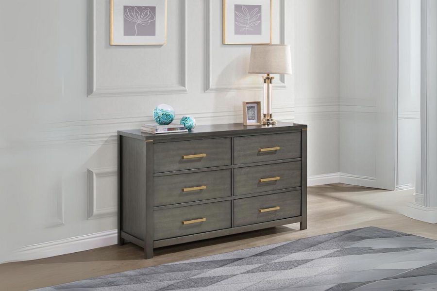 | * A modern six-drawer dresser offering impeccable style mixed with impressive storage * Gray wood grain finish is soft and on-trend with a timeless feel * Golden brass toned trim and pulls add warmth and elegance to a tailored presentation * Top drawers include felt lining that lends a luxurious finishing touch * Add the matching framed mirror to create a cohesive set perfect for morning rituals |