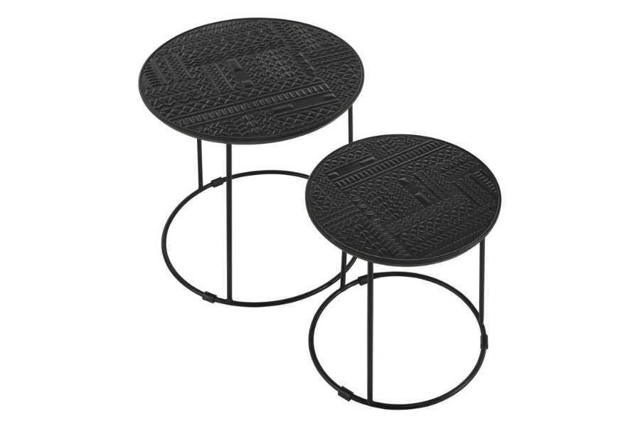 * Solid eco-friendly mango wood two-piece nesting table * Features an Ink blot embossed wood top with a matte black finished base * Great fit for small spaces—hide the small table under the larger one to save space |
