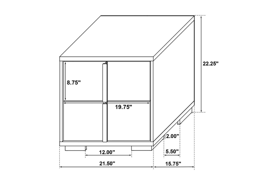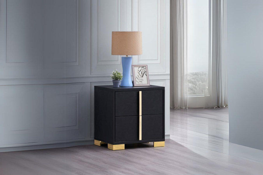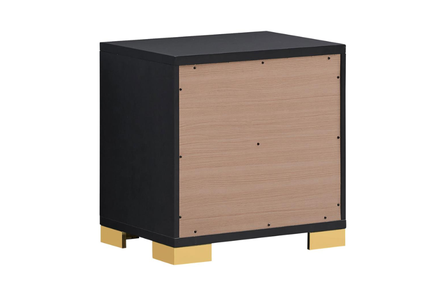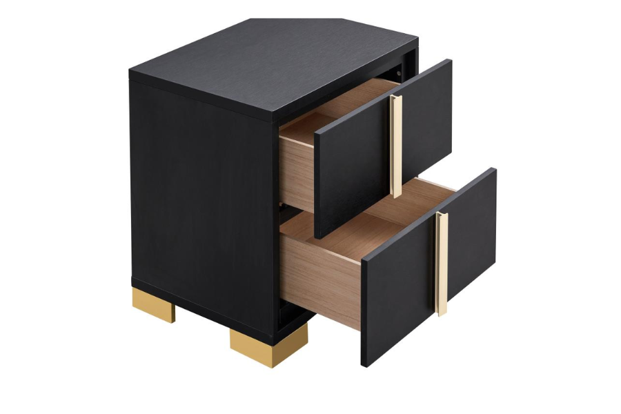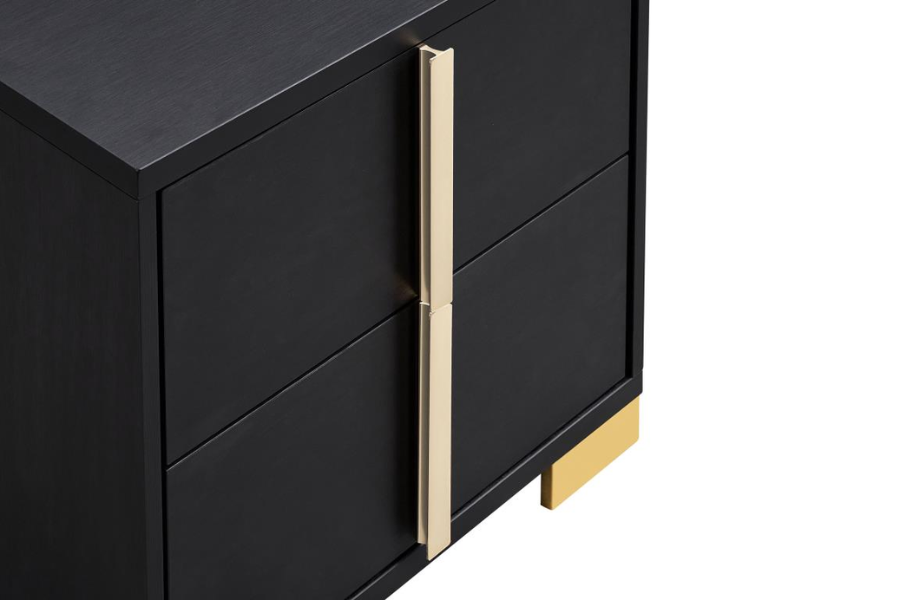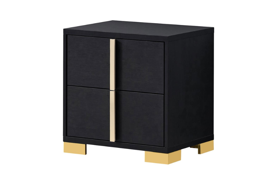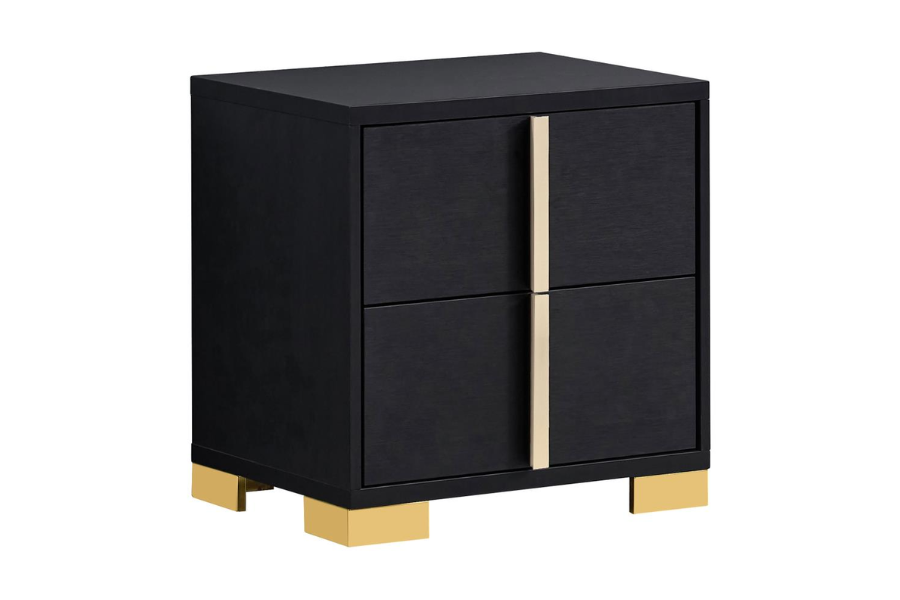 * Exotic and alluring bold look to transform master or guest bedroom into inviting venue * Modern design details produce chic Art Deco vibe nightstand with tons of elegance * Wood products construction with versatile finish and gold finish metal accents for geometric linear effect * Two drawers operating smoothly on center metal glides with English dovetail drawer construction * Vertical gold metal hardware for unique impact |