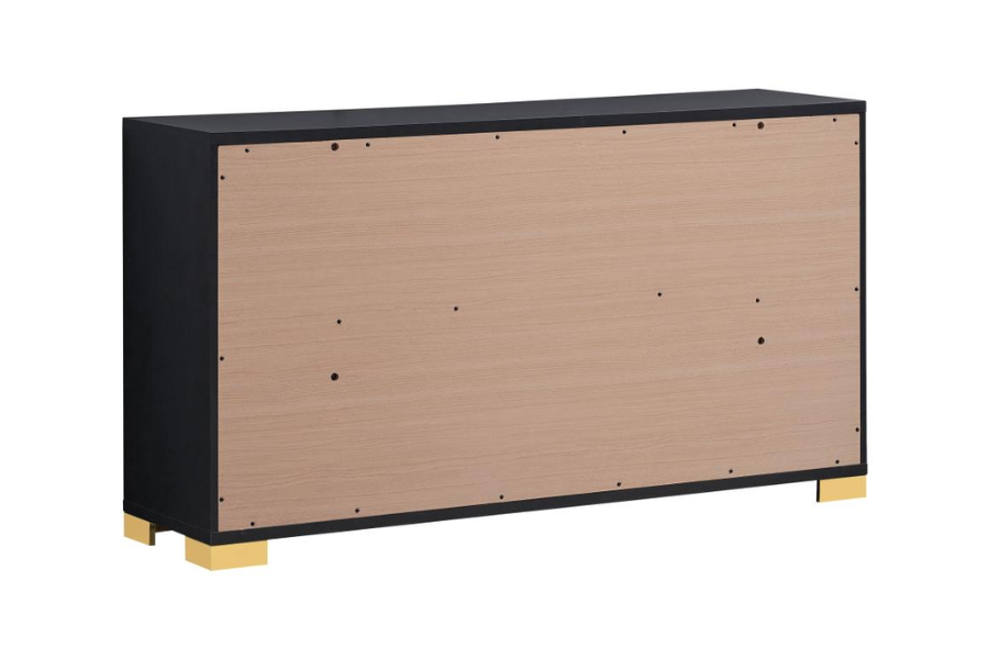 * Sleek black finish with gold accents for a contemporary look * 4-piece twin bedroom set includes bed with LED headboard, nightstand, dresser, and mirror * LED headboard with touch switches for easy operation * Dresser topped with framed mirror for added storage and style * Mood lighting creates a lovely ambiance in the bedroom |