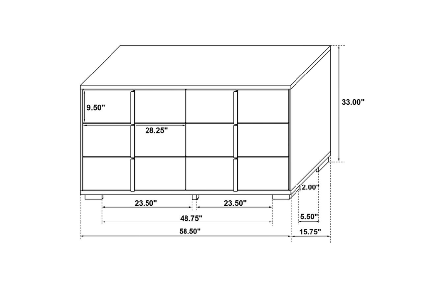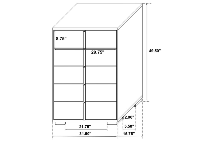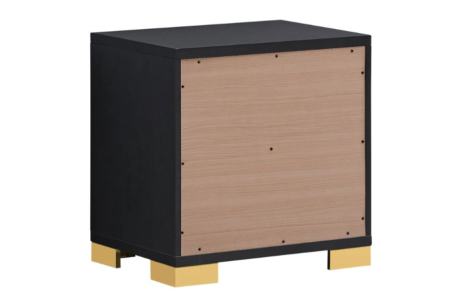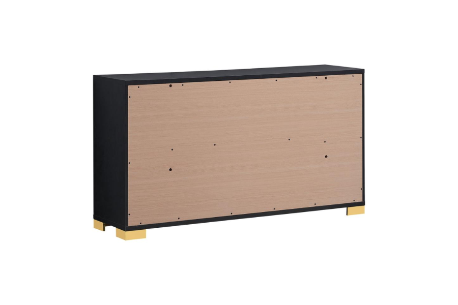 * Sleek black finish with gold accents for a contemporary look * 5-piece eastern king bedroom set includes bed with LED headboard, nightstand, dresser, mirror, and chest * LED headboard with touch switches for easy operation * Dresser topped with framed mirror for added storage and style * Mood lighting creates a lovely ambiance in the bedroom |