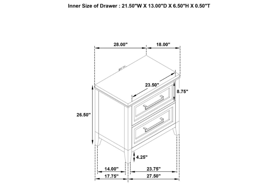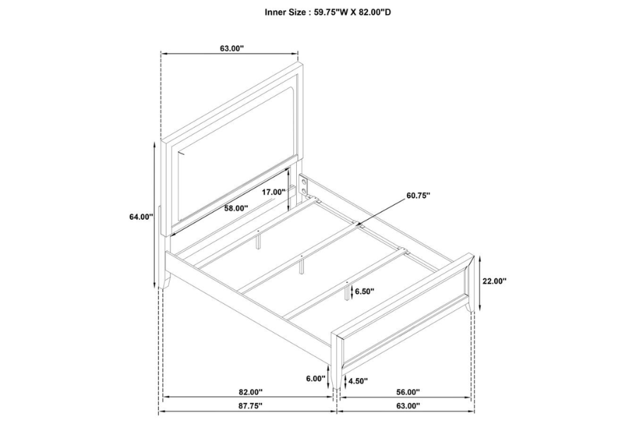 * A five-piece modern bedroom set features LED lighting and offers a clean-lined silhouettes * Integrated LED lighting lines a squared, upholstered headboard that offers white fabric * Distressed white finish highlights wood grain details and bar hardware to create texture and depth * Six-drawer dresser, five-drawer chest and two-drawer nightstand offer plenty of bedroom storage * The bed features a low footboard for an airy open look and requires a foundation |