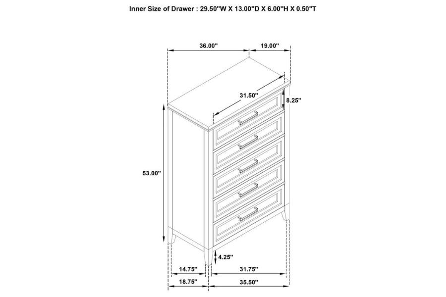 * A five-piece modern bedroom set features LED lighting and offers a clean-lined silhouettes * Integrated LED lighting lines a squared, upholstered headboard that offers white fabric * Distressed white finish highlights wood grain details and bar hardware to create texture and depth * Six-drawer dresser, five-drawer chest and two-drawer nightstand offer plenty of bedroom storage * The bed features a low footboard for an airy open look and requires a foundation |