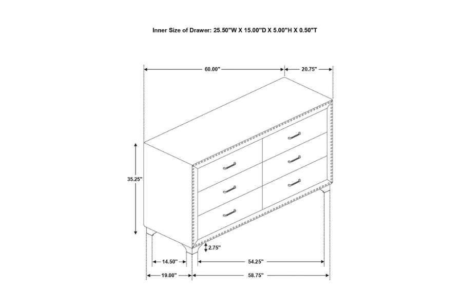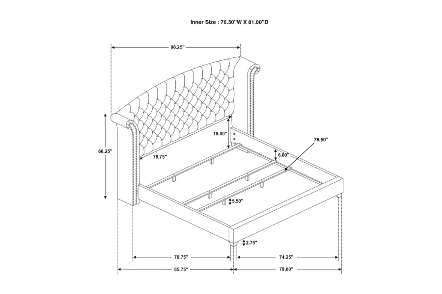 * Create a grand and glamorous feel in your bedroom with an elegance that will refresh your thoughts every time you enter * Entirely upholstered with matte velvet in options of pacific blue or grey with acrylic bling tufted buttons accented with crystal and chrome pull handles * Chrome finished metal legs and hand applied nailhead trim amplifies the design's contemporary expression * Exquisite with an impressive plush, matte velvet cover * Unbelievable value and exclusive to Coaster |