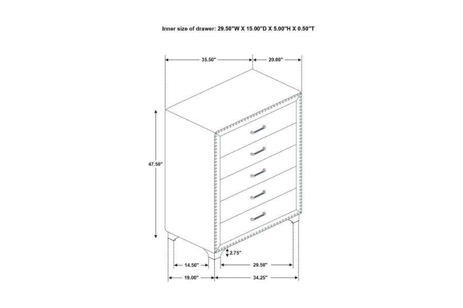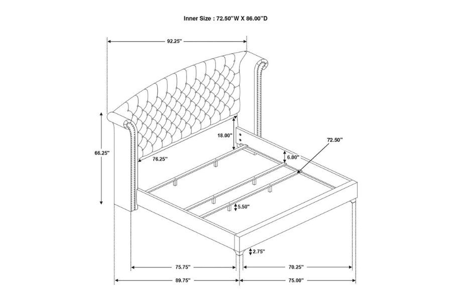 | * Create a grand and glamorous feel in your bedroom with an elegance that will refresh your thoughts every time you enter * Entirely upholstered with matte velvet in options of pacific blue or grey with acrylic bling tufted buttons accented with crystal and chrome pull handles * Chrome finished metal legs and hand applied nailhead trim amplifies the design's contemporary expression * Exquisite with an impressive plush, matte velvet cover * Unbelievable value and exclusive to Coaster |
