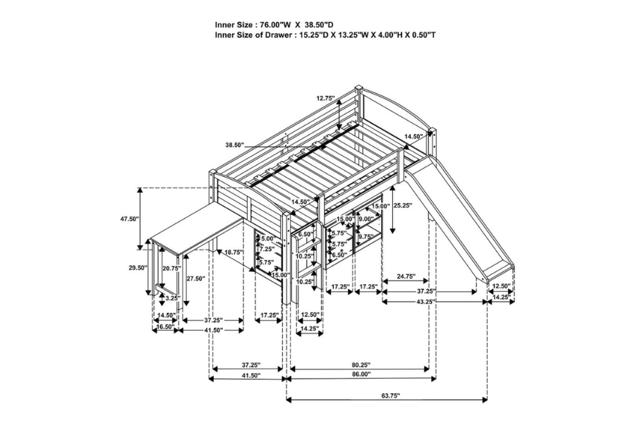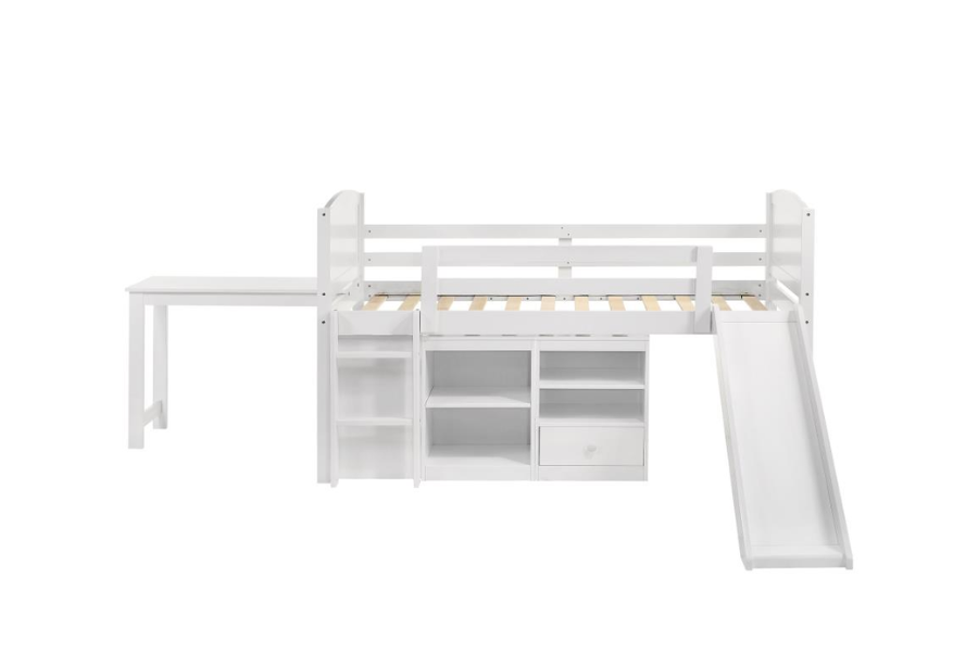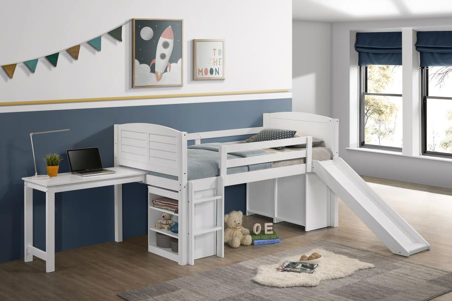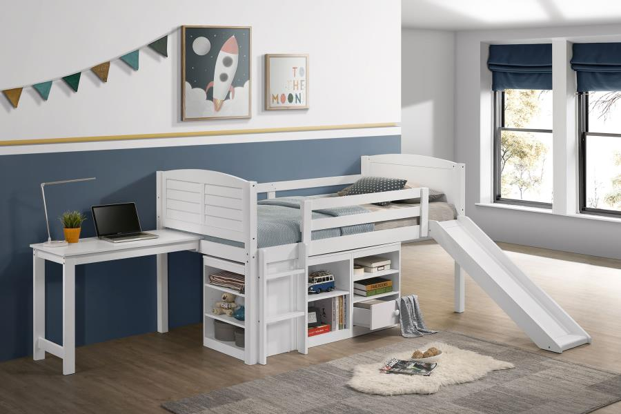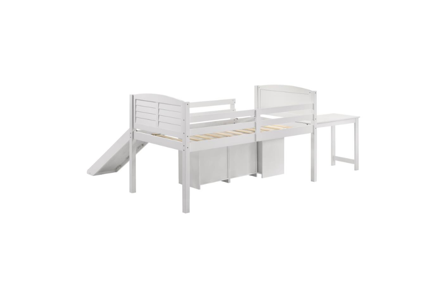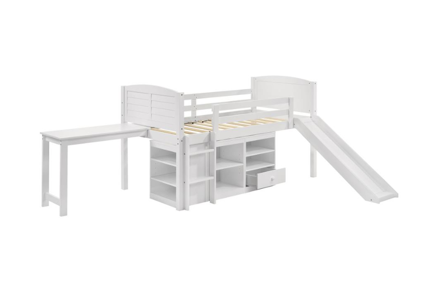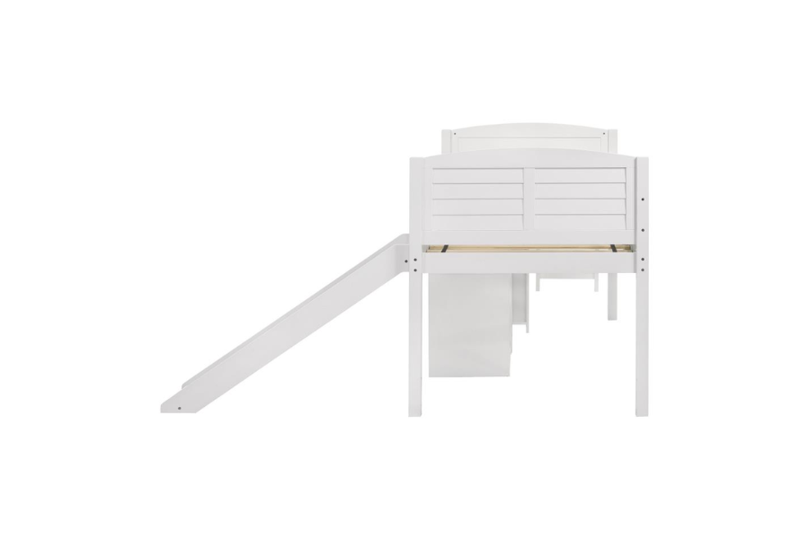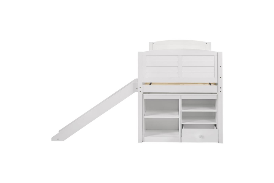 * Twin loft bed finished in white * Added extra-fun slide is included and can be assembled on either the left or right side * Desk and open shelves offer plenty of space for your little one to display their treasures * Constructed with solid rubberwood, plywood, and MDF * Slat kit included |