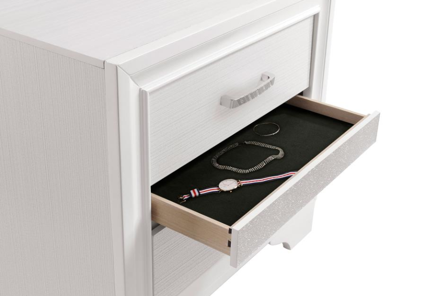 * Glittering stripes add energy to a contemporary design with glamour at the forefront * Elegant and timeless design with just the right amount of bling * Bed features storage at footboard and is fully slatted * Bed has platform system that will accommodate most mattress types and warranties including memory foam * 35mm drawer glides used for secret drawers in dresser & chest * Exclusive acrylic crystal pull handles set this collection apart * Available in a white or black finish |