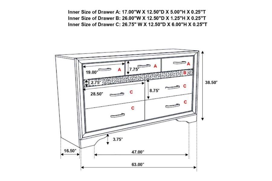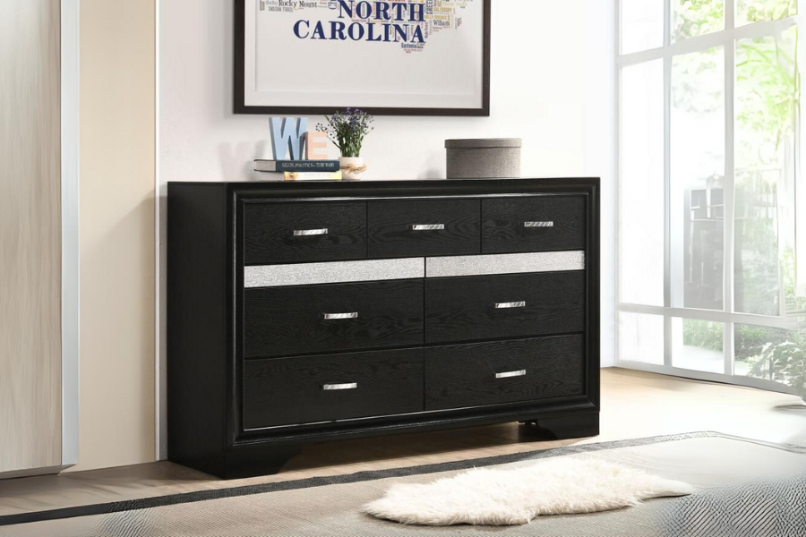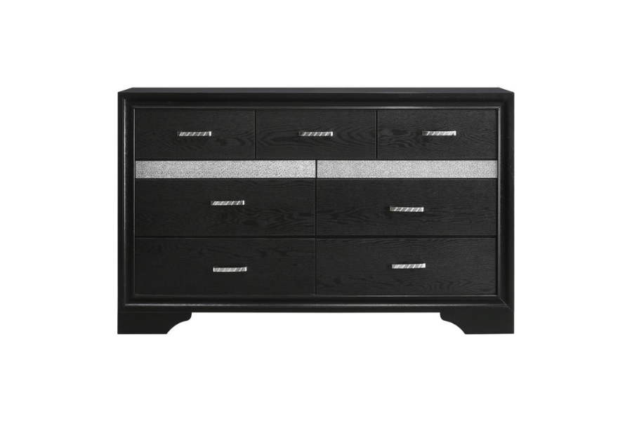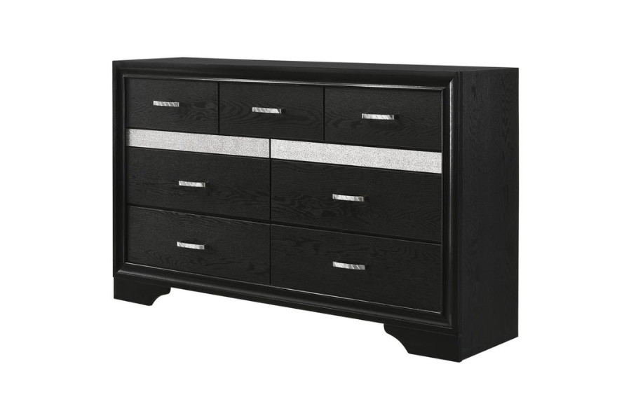 * Glittering stripes add energy to a contemporary design with glamorous at the forefront * Elegant and timeless design with just the right amount of "bling" * Chest and dresser have hidden felt-lined drawers to protect your jewelry * Exclusive rhinestone pull handles set this collection apart * Available in white and black finish |