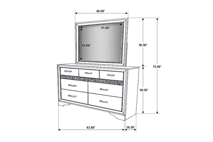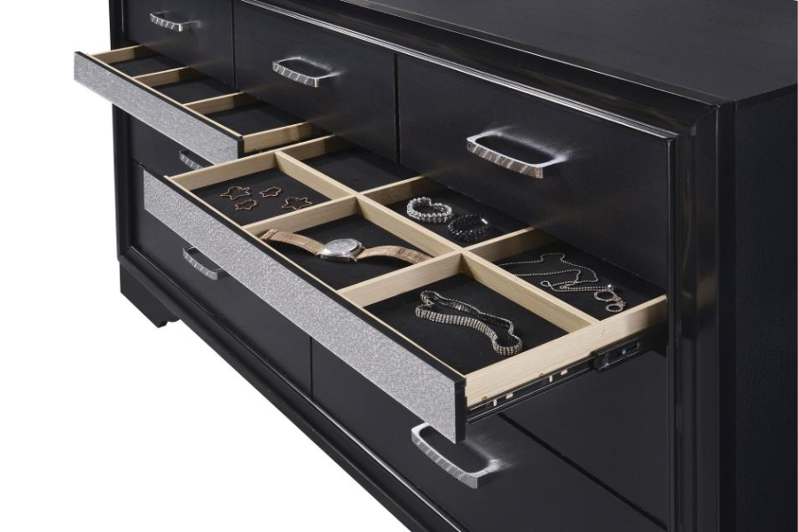 | * Sophisticated dresser with felt-lined drawers for delicate items * Hidden jewelry drawer for discreet storage * Sparkling front panel for opulent charm * Cheerful mirror with linear, dimensional design * Selection of finishes to complement your bedroom decor |