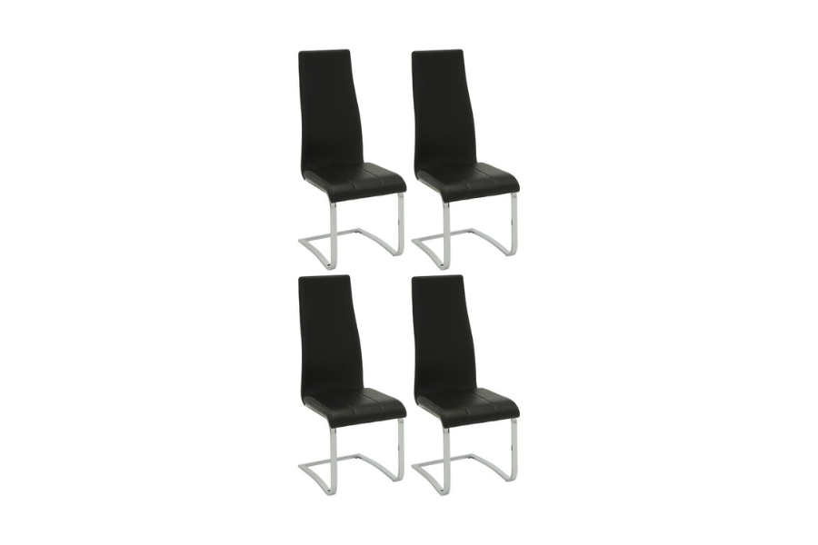 | This set of four side chairs add a modern touch to a contemporary dining space. Each contemporary dining chair features an elongated backrest that is reminiscent of the iconic Breuer design, further lending to its modern flair. Invite guests over for a long evening of dinner and drinks, knowing they are comfortable and supported by an ergonomic curved backrest wrapped in a foam-filled grey leatherette. A padded seat features a waterfall front edge that falls elegantly into a U-shaped chrome finish frame and leg supports. In addition, this set of four chairs is available to suit your current color palette, offered in multiple colors to suit your tastes. | |