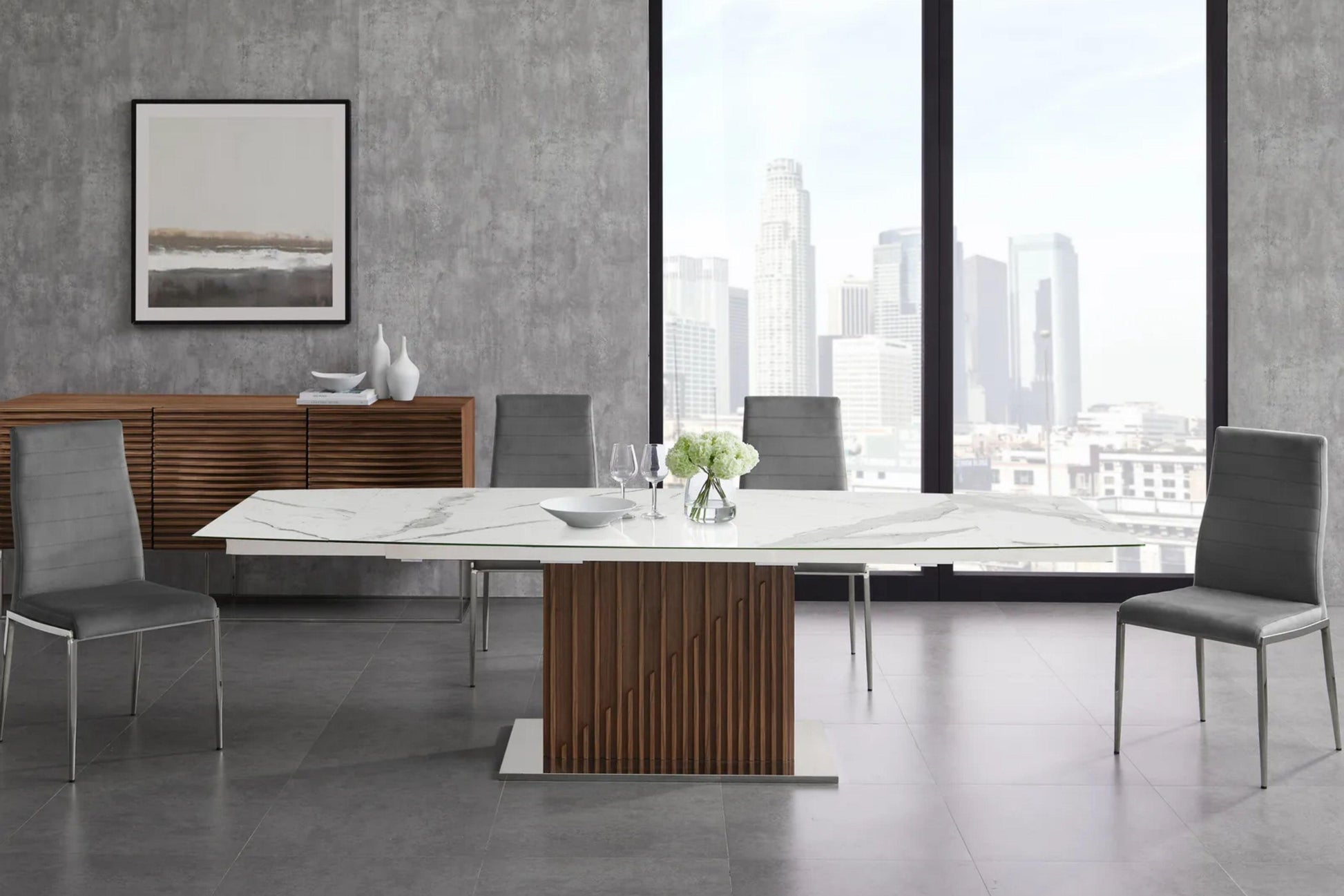 The MOON extendable dining table with walnut base by Venini features clean, modern lines adding a sophisticated look and edge to any room. Our MOON extendable dining seats 6-14 people depending on your configuration. Constructed using top materials with stainless steel, glass, mdf with exceptional quality that are made to last.