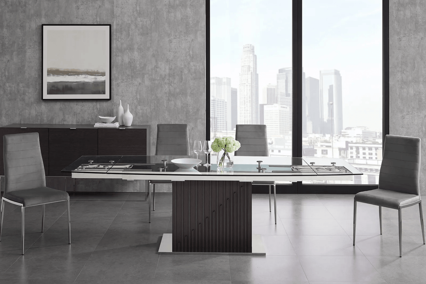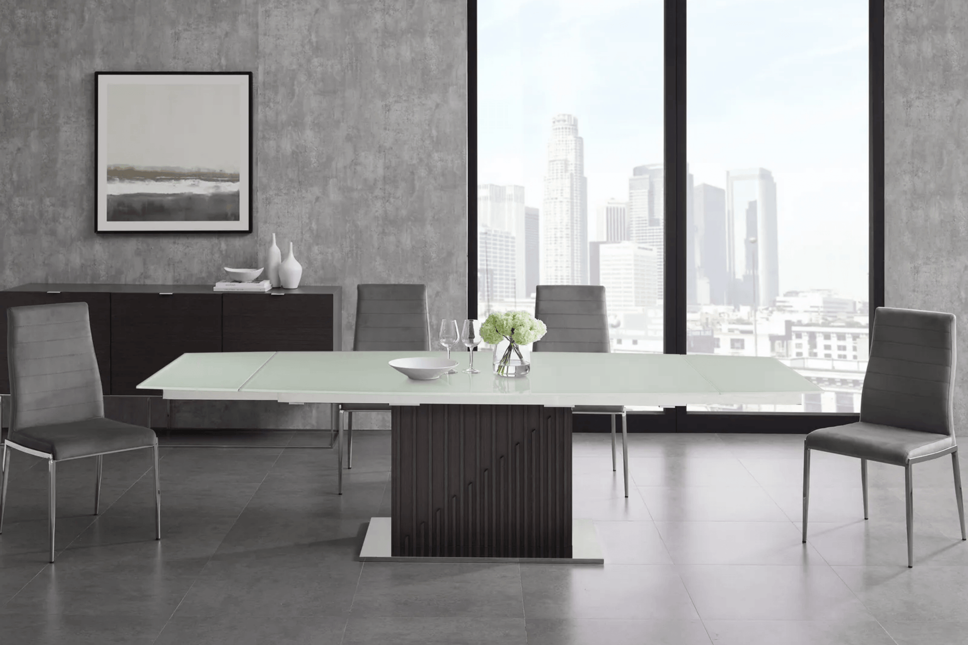 The Moon extendable dining table with dark gray oak base by Venini features clean, modern lines adding a sophisticated look and edge to any room.
